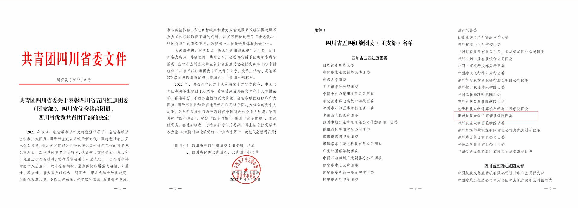 五四前夕,共青團中央印發(fā)關(guān)于表彰全國五四紅旗團委(團支部)、全國優(yōu)秀共青團員、全國優(yōu)秀共青團干部的決定,共青團四川省委、四川省青年聯(lián)合會印發(fā)關(guān)于表彰第25屆“四川青年五四獎?wù)隆钡臎Q定,共青團四川省委印發(fā)關(guān)于表彰省五四紅旗團委(團支部)、省優(yōu)秀共青團員、省優(yōu)秀共青團干部的決定,我校統(tǒng)計學(xué)院2018級經(jīng)濟統(tǒng)計專業(yè)袁秋同學(xué)榮獲“全國優(yōu)秀共青團員”,中國金融研究中心教師文書洋被授予第25屆“四川青年五四獎?wù)隆保ど坦芾韺W(xué)院團委榮獲“四川省五四紅旗團委”。