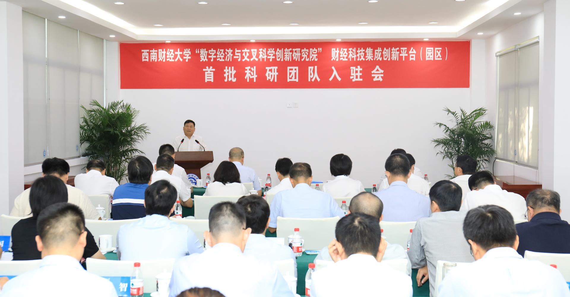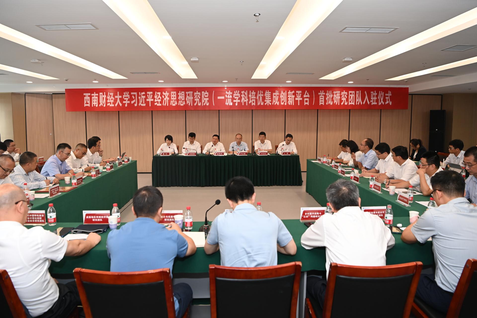 9月1日下午,“習近平經濟思想研究院”一流學科培優集成創新平臺和“數字經濟與交叉科學創新研究院”財經科技集成創新平臺首批研究團隊入駐儀式先后在柳林校區誠正樓和光華校區崇文樓舉行,學校黨委書記趙德武,黨委副書記、校長李永強,黨委副書記、紀委書記孫殿明,黨委常委、副校長尹慶雙出席會議并為入駐團隊授牌。