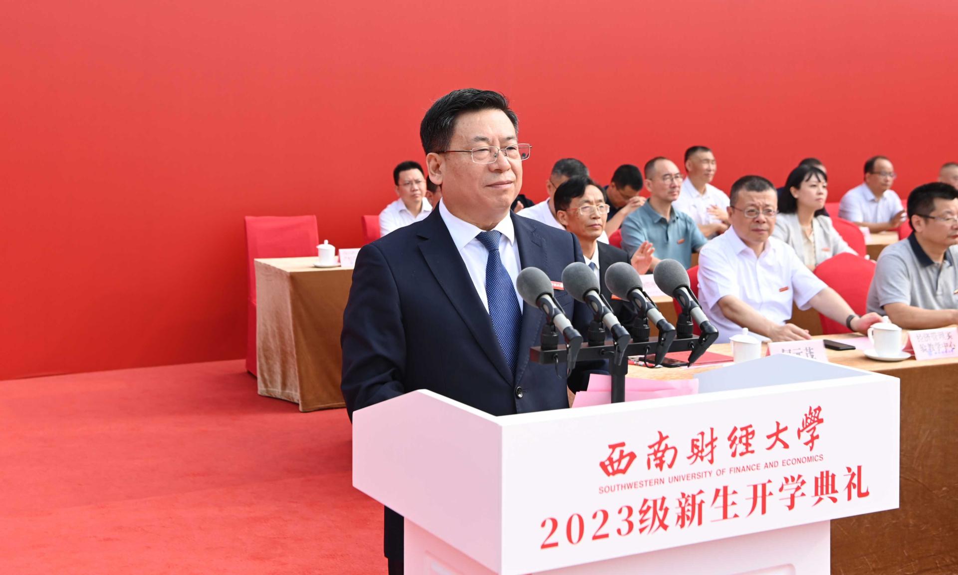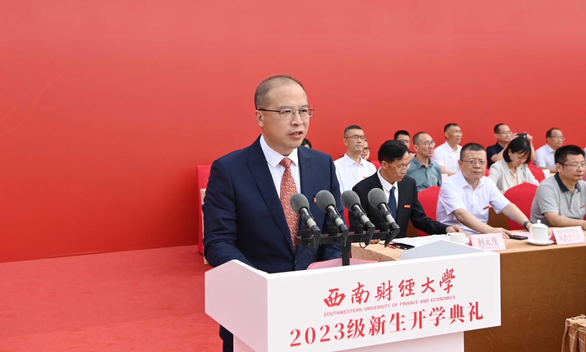 趙德武主持典禮時(shí)深情回顧了學(xué)校在98年光輝歲月中寫就的“格致誠(chéng)正、興學(xué)報(bào)國(guó)”“經(jīng)世濟(jì)民、孜孜以求”“為黨育人、為國(guó)育才”奮斗史。他指出,黨的二十大擘畫了以中國(guó)式現(xiàn)代化全面推進(jìn)中華民族偉大復(fù)興的宏偉藍(lán)圖,學(xué)校黨委深入學(xué)習(xí)貫徹黨的二十大精神,圍繞“教育強(qiáng)國(guó),西財(cái)何為?”這一重大時(shí)代課題,作出全面推進(jìn)“新財(cái)經(jīng)”戰(zhàn)略升級(jí)重大部署,在教育強(qiáng)國(guó)建設(shè)中更好展現(xiàn)西財(cái)擔(dān)當(dāng)。他強(qiáng)調(diào),新時(shí)代中國(guó)青年,生逢盛世、肩負(fù)重任,即將成為“新財(cái)經(jīng)”受益者、參與者和推動(dòng)者的2023級(jí)西財(cái)人,要立志求學(xué)、追求卓越,為一生的精彩打下堅(jiān)實(shí)的基礎(chǔ)。他深情寄語,要堅(jiān)定理想信念,在把穩(wěn)青春航向中做“有志”青年,堅(jiān)定不移聽黨話、跟黨走,自覺做習(xí)近平新時(shí)代中國(guó)特色社會(huì)主義思想的堅(jiān)定信仰者、積極傳播者、忠實(shí)踐行者,時(shí)刻關(guān)注黨和國(guó)家的大事,深入了解國(guó)情社情民情,永懷為民之志、砥礪強(qiáng)國(guó)之志、激揚(yáng)復(fù)興之志。要練就過硬本領(lǐng),在追逐青春夢(mèng)想中做“有識(shí)”青年,深刻把握世界科技前沿和國(guó)家重大戰(zhàn)略需求,敏于求知、勤于學(xué)習(xí)、勇于實(shí)踐,學(xué)會(huì)思維方法、厚實(shí)學(xué)科基礎(chǔ)、掌握硬核技術(shù),積極投身中國(guó)式現(xiàn)代化的火熱實(shí)踐,豐厚開卷有益的學(xué)識(shí)、增長(zhǎng)開闊廣博的見識(shí)、練就開拓創(chuàng)新的膽識(shí)。要矢志拼搏奮斗,在展現(xiàn)青春擔(dān)當(dāng)中做“有為”青年,深入踐行“請(qǐng)黨放心、強(qiáng)國(guó)有我”的青春誓言,時(shí)刻牢記“奮斗是青春最亮麗的底色,行動(dòng)是青年最有效的磨礪”,勇?lián)鷷r(shí)代使命、敢于迎難而上、涵養(yǎng)斗爭(zhēng)精神,積蓄敢想敢為的勇氣、涵養(yǎng)實(shí)干實(shí)為的作風(fēng)、增強(qiáng)善作善為的自覺。趙德武祝愿2023級(jí)全體新同學(xué),在西南財(cái)大加強(qiáng)品德修養(yǎng)、增長(zhǎng)知識(shí)見識(shí)、培養(yǎng)奮斗精神、增強(qiáng)綜合素質(zhì),立大志、明大德、成大才、擔(dān)大任,以實(shí)際行動(dòng)在強(qiáng)國(guó)建設(shè)、民族復(fù)興偉業(yè)中書寫新時(shí)代西財(cái)青年的最美華章!