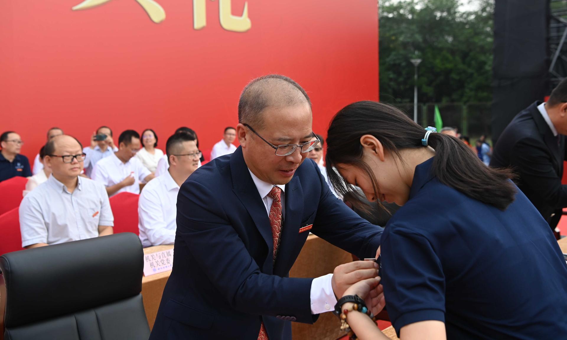 儀式中,學(xué)校領(lǐng)導(dǎo)為新同學(xué)代表佩戴校徽,全體新同學(xué)現(xiàn)場(chǎng)集體佩戴校徽并莊嚴(yán)宣誓。“西南財(cái)經(jīng)大學(xué)”熠熠生輝,大學(xué)精神深深烙刻心中,鏗鏘青春誓言久久回蕩……