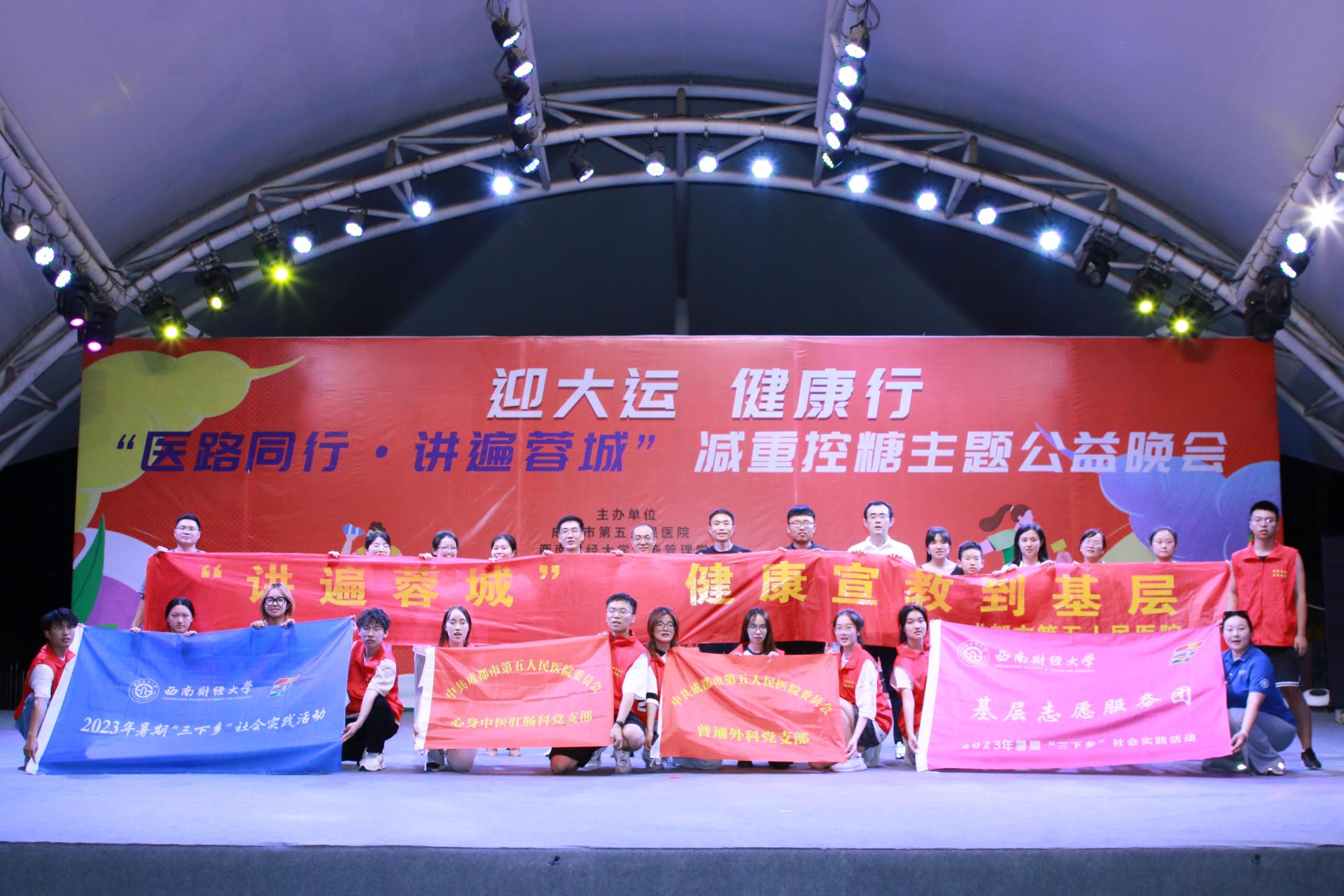 “醫路同行 健康中國”青宣服務隊與成都市第五人民醫院及溫江區柳城街道光華社區共同發起了“減重控糖·醫路同行”暑期系列活動。活動以“醫路同行·講遍蓉城”減重控糖主題公益晚會拉開序幕,五醫院專家以營養卡片、運動挑戰等富有科室專業特色的游戲活動,結合案例講解與現場互動,向現場觀眾講解了肥胖的危害和科學減肥的健康知識。晚會后服務隊與五醫院進一步合作,在線上線下同時發起“暑期減重大挑戰”。
