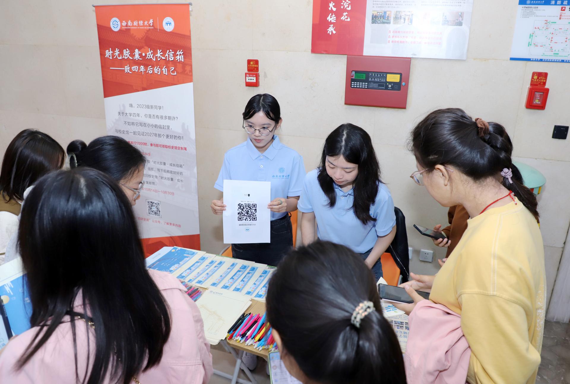 活動現(xiàn)場還開展了新生“時光膠囊·成長信箱”活動。新生們紛紛領(lǐng)取專屬信封信紙,滿懷希望與憧憬寫下“致未來自己的一封信”,信件投遞后,將由檔案館、校史館代為封存,并在畢業(yè)之際由學生重新開啟,以此來記錄夢想、見證成長。“時光膠囊”系列活動自2014年起面向畢業(yè)生開啟,旨在喚起同學們對未來學習工作的思考和規(guī)劃,提醒激勵同學們樹立目標,明確方向。今年首次針對新生開展,受到新生們的廣泛歡迎,現(xiàn)場發(fā)放1000余封。