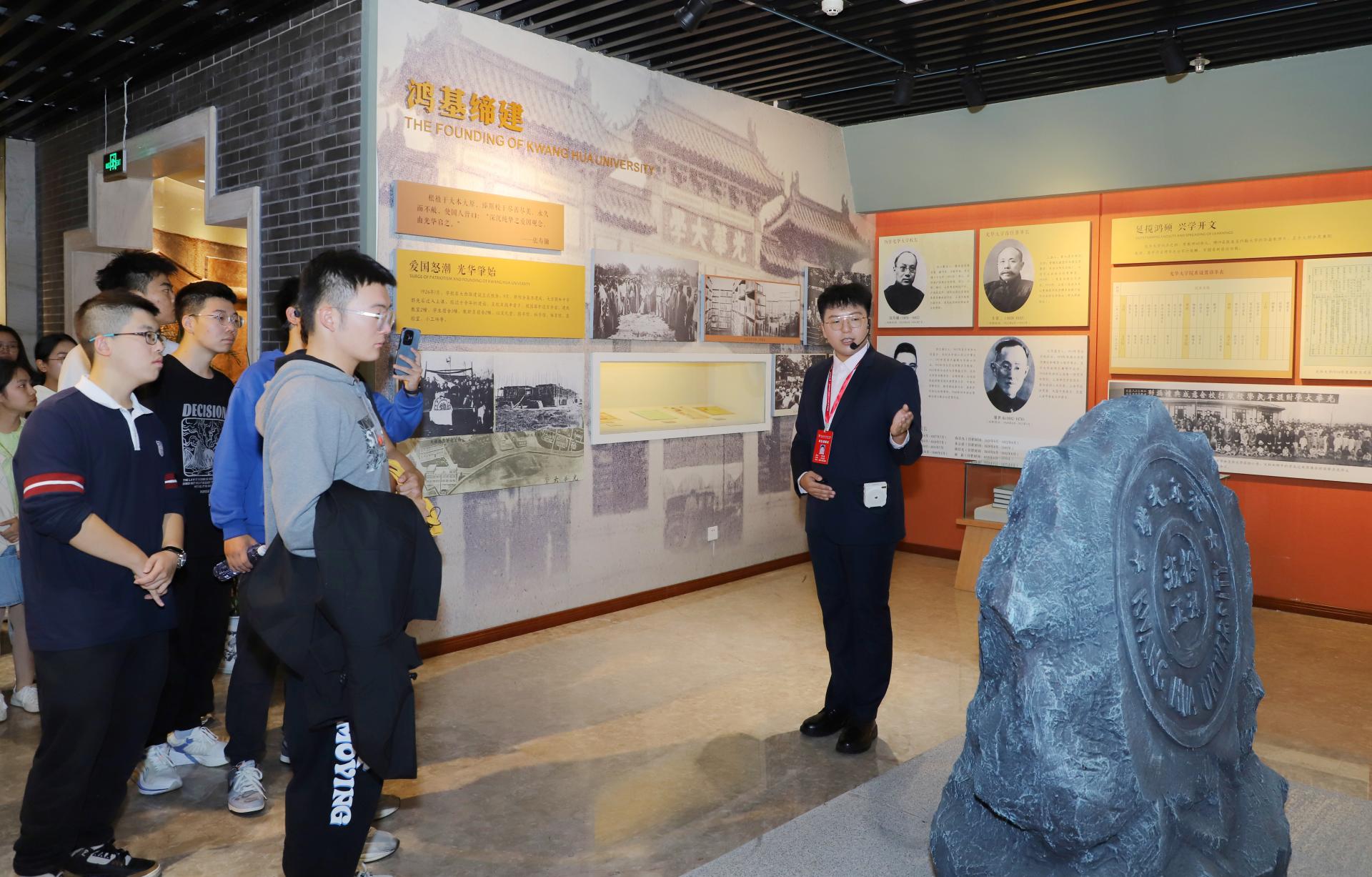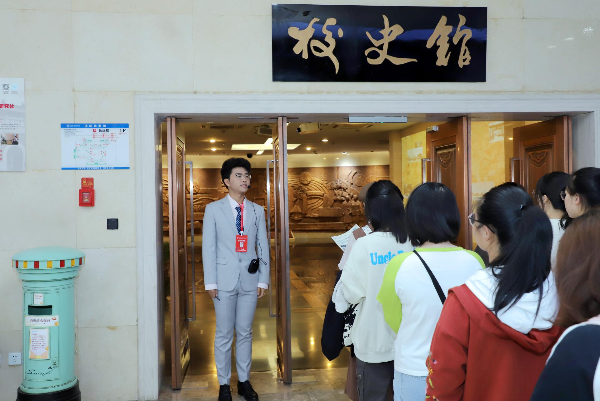 校史館共分序廳、日月光華、丹心鐵卷、鯤激鵬舉、云帆遠濟和專題展區(qū)六個展區(qū),展示了學校與國家民族共命運、與時代發(fā)展同進步的輝煌歷程。在學生講解員的精彩解說中,2023級新生學習了學校在98年光輝歲月中寫就的“格致誠正、興學報國”的奮斗歷史和精彩故事。