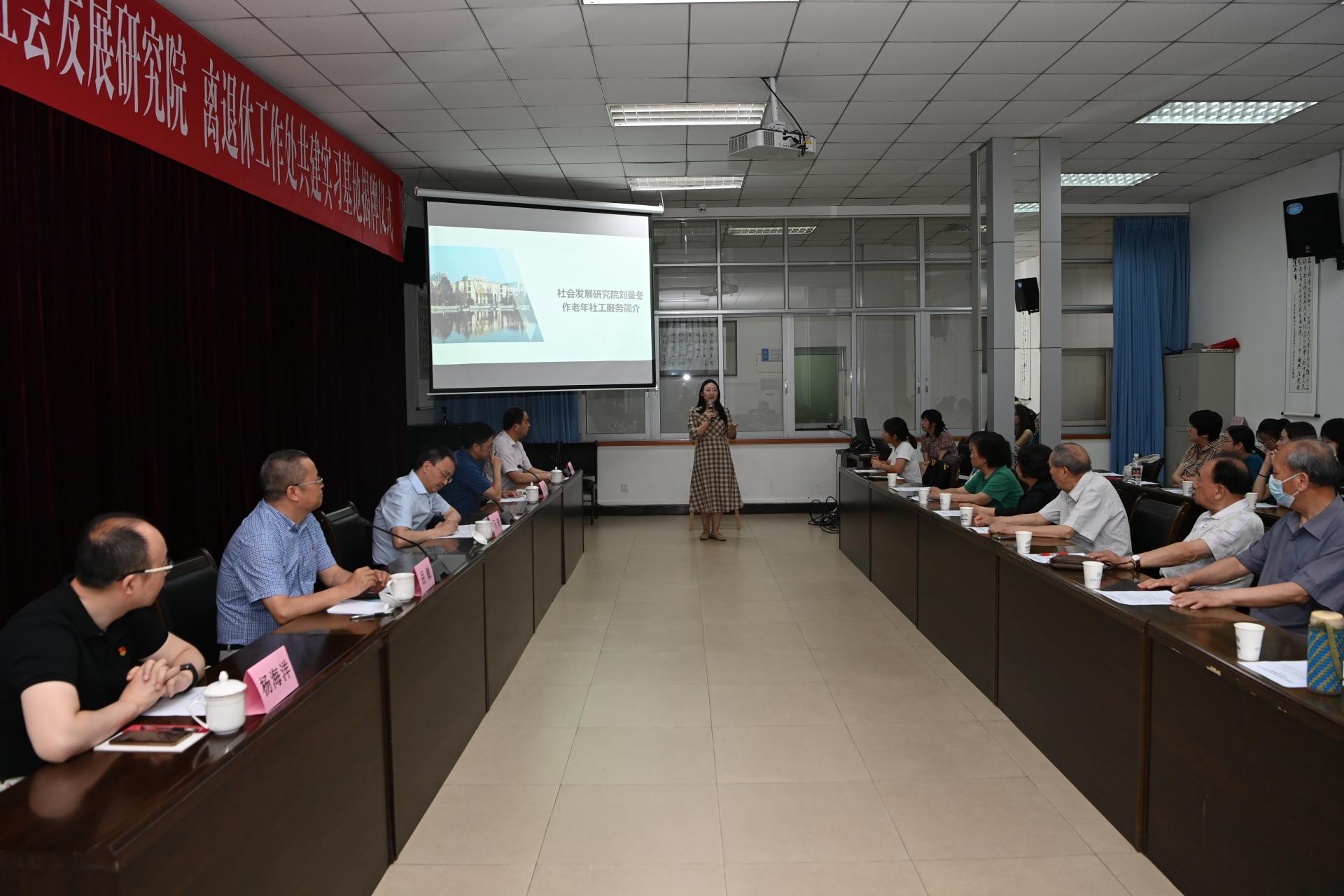岳敏介紹了社會發(fā)展研究院的專業(yè)發(fā)展和師資隊伍情況,張立斌介紹了學校離退休老同志的基本情況,雙方表達了共建實習基地美好祝愿和合作信心。社會發(fā)展研究院教師劉曼冬和學生代表黃莉莉向大家介紹了老年社工服務的基本情況。