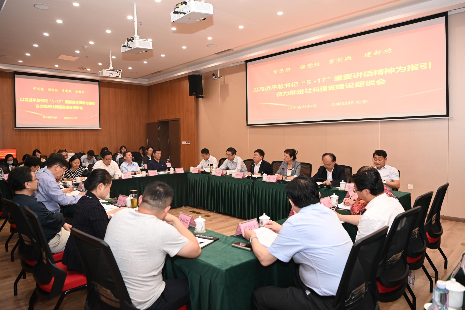5月17日下午,我校與四川省社科聯(lián)聯(lián)合主辦的“以習近平總書記‘5·17’重要講話為指導 奮力推進社科強省建設(shè)”座談會在四川社會科學館舉行。四川省社科聯(lián)黨組書記、副主席姜怡,我校黨委書記、四川省社科聯(lián)副主席趙德武教授,四川大學副校長、四川省社科聯(lián)副主席姚樂野教授,四川師范大學黨委副書記、校長汪明義教授,我校黨委常委、副校長尹慶雙教授,中共四川省委黨校(四川行政學院)副校(院)長裴澤慶教授,四川省社科院副院長李中鋒教授,四川省社會科學學術(shù)期刊協(xié)會會長何一民教授,我校經(jīng)濟學院院長蓋凱程教授等專家學者,省社科聯(lián)黨組班子成員,省教育廳、省社科聯(lián)相關(guān)處室負責人,以及我校科研處負責人和師生代表等共60余人參加座談會。姜怡主持座談會。
