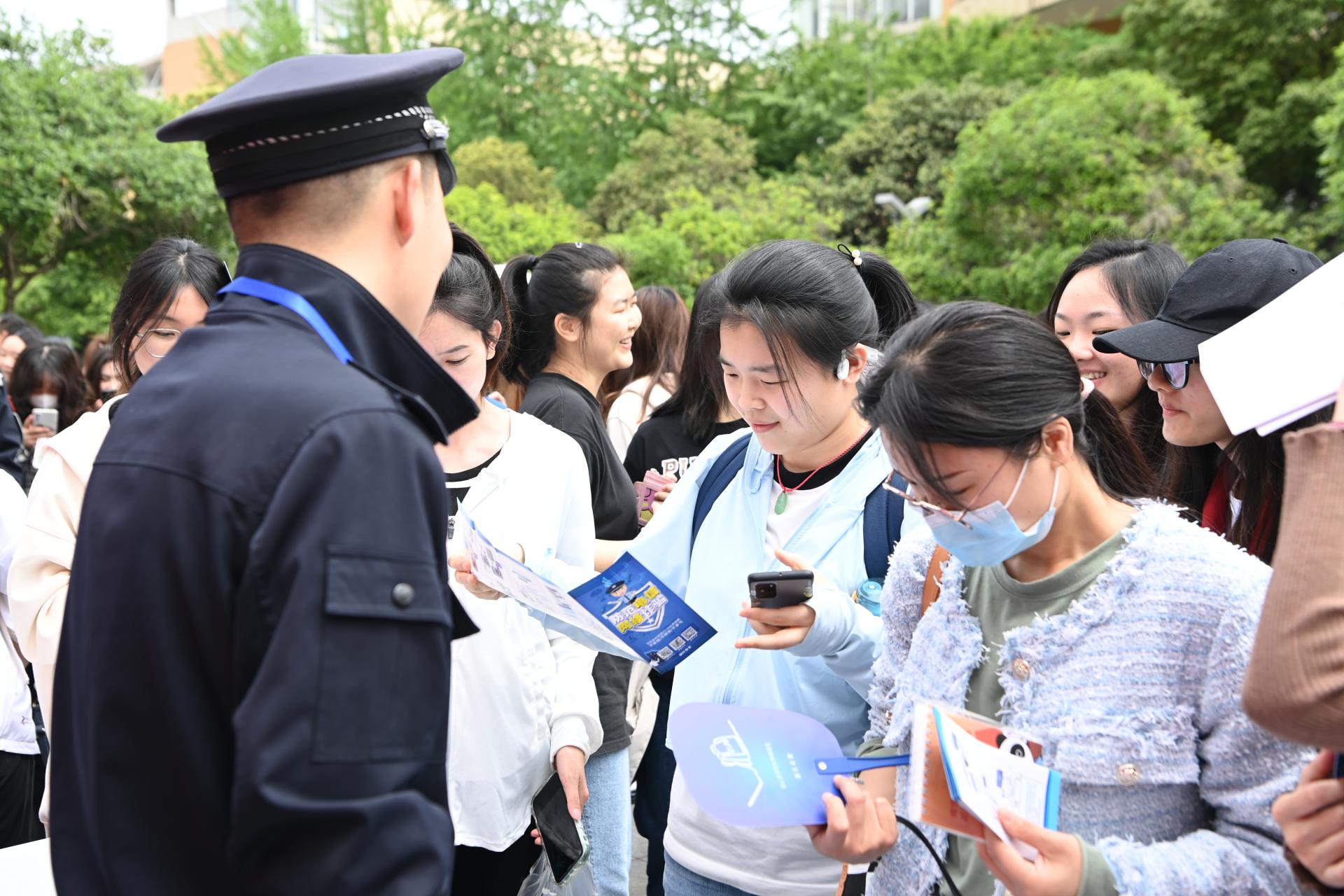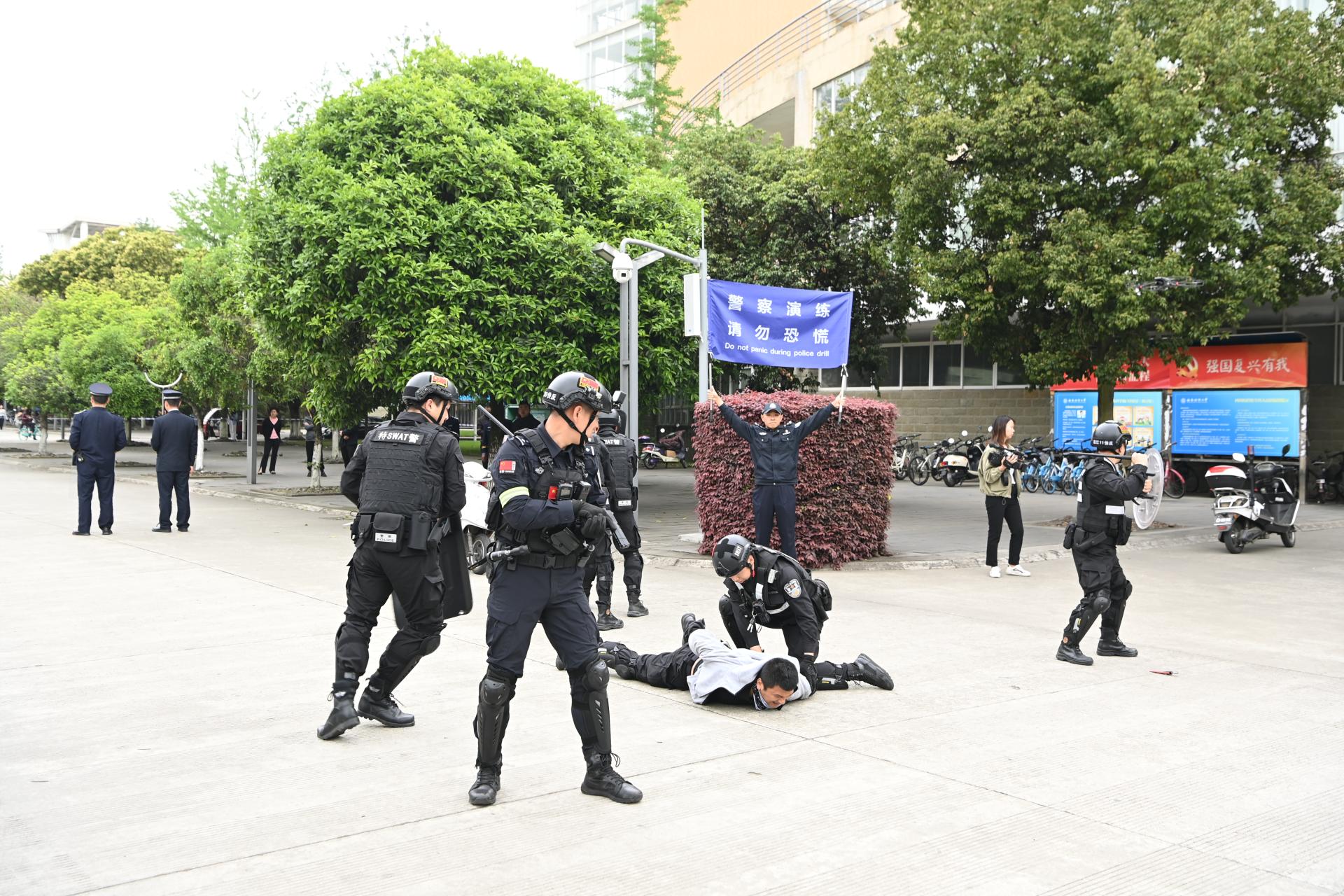 學校保衛處(武裝部)處長劉梟主持現場演練,就本次活動的目的和意義、學校在“全民國家安全宣傳周”開展的系列宣傳教育活動做了簡要介紹。溫江公安分局干警演示防暴摩托和防護裝備、訓演警犬,講解國家安全知識,開展防騙反詐技能演示并發放相關資料,與現場師生充分互動。