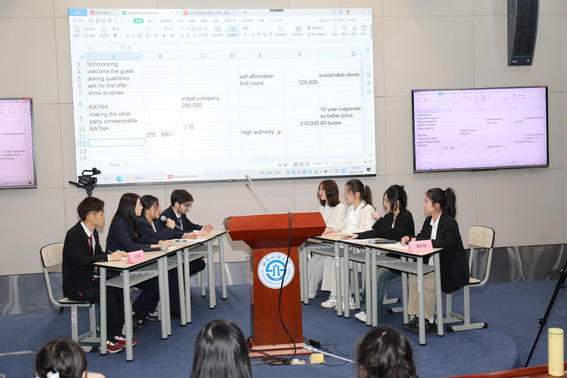 公開課環節,我校外國語學院教師吳瑾以“口譯中的視譯技巧”為題講授公開課,從Fast conversion(快速轉化)、Sight interpreting(視譯)、Simulation in simultaneous mode(同聲傳譯模擬)三個部分,結合黨的二十大報告文本,逐一點評近百個口譯案例。潘紫萌老師講授《國際商務談判》公開課,運用案例式、任務式、啟發式教學法,介紹了談判策略和技巧,學生現場模擬美國LBT和比亞迪的談判,并對學生的模擬談判進行現場點評。黃志華老師主講《商務英語聽說》公開課,以中國制造業在新時代取得的矚目成就為切入口,采用任務式與交際法的教學理念,深入淺出地向學生講解了華為、聯想等中國企業踐行人與自然和諧共生的中國式現代化理念的具體實踐。