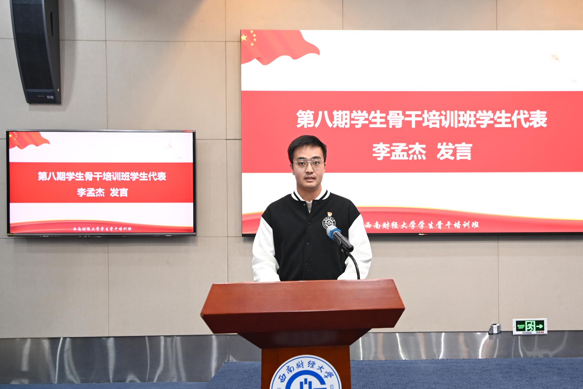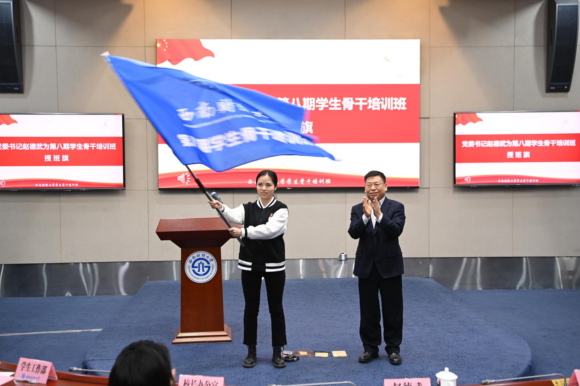 開班儀式上,趙德武為第八期學生骨干培訓班授旗,寄語第八期學員珍惜學習機會,勤奮刻苦、守正創新;敢想敢為、善作善成,努力做西財青年的優秀代言者,做中國夢西財篇章的積極譜寫者,做習近平新時代中國特色社會主義思想的忠實踐行者,奮力在中國式現代化道路上譜寫西財新篇章。與會成員共同觀看了前七期結業學員代表對第八期新學員的祝福視頻。隨后,第八期培訓班學員李孟杰同學代表新一期學員發言,表示要以“樹雄心大志,當時代先鋒”班訓為指引,踔厲奮發,勇毅前行。