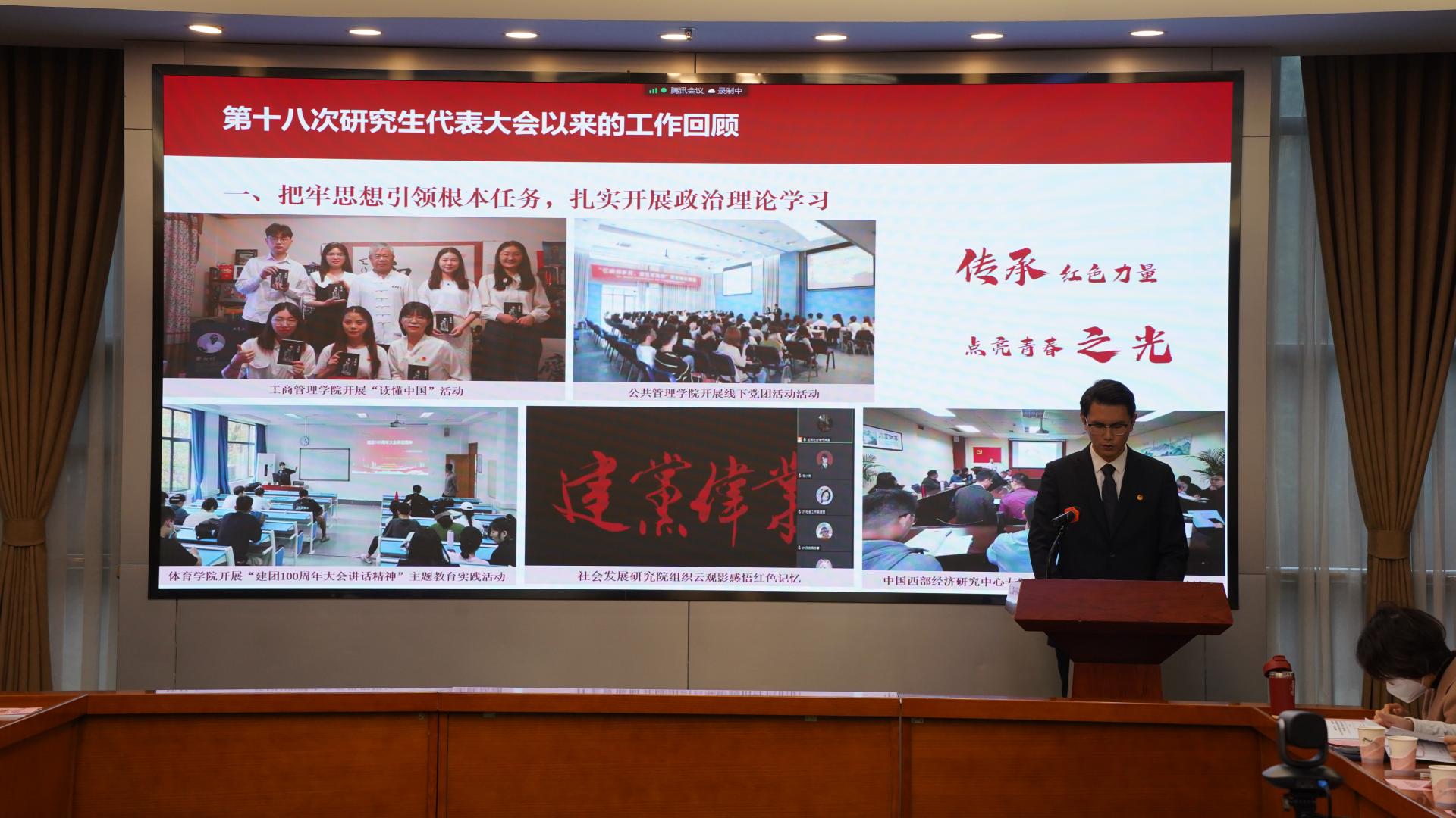 薛寶冰同學(xué)代表第二十五屆學(xué)生會(huì)委員會(huì)向大會(huì)作《西南財(cái)經(jīng)大學(xué)第二十五屆學(xué)生會(huì)委員會(huì)工作報(bào)告》。李志鵬同學(xué)代表第十八屆研究生會(huì)委員會(huì)向大會(huì)作《西南財(cái)經(jīng)大學(xué)第十八屆研究生會(huì)委員會(huì)工作報(bào)告》。