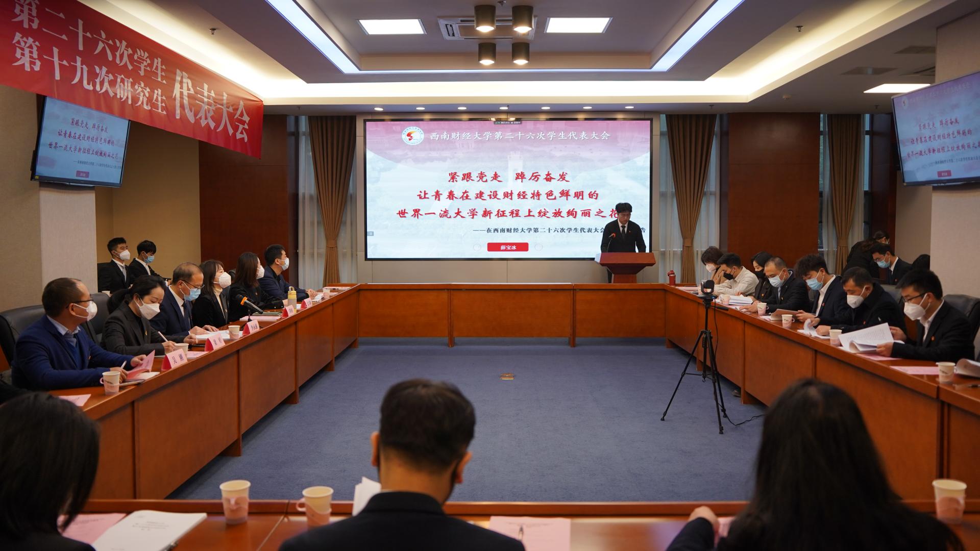 12月13日,經(jīng)學(xué)校黨委和四川省學(xué)聯(lián)批復(fù)同意,西南財(cái)經(jīng)大學(xué)第二十六次學(xué)生代表大會(huì)、第十九次研究生代表大會(huì)在柳林校區(qū)召開(kāi)。校黨委副書(shū)記、副校長(zhǎng)李永強(qiáng),學(xué)生工作部、校團(tuán)委、研究生院相關(guān)負(fù)責(zé)人以及各學(xué)院(研究院)團(tuán)組織負(fù)責(zé)人,全校137名學(xué)代會(huì)代表、100名研代會(huì)代表通過(guò)線上線下方式參加會(huì)議。