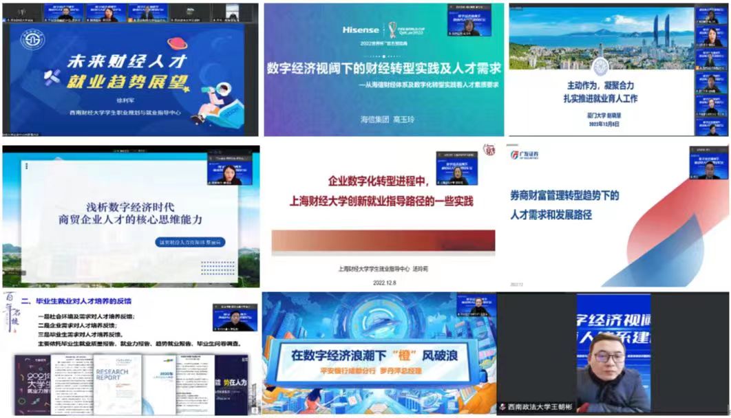 在主題分享環(huán)節(jié),我校學(xué)生職業(yè)規(guī)劃與就業(yè)指導(dǎo)中心主任徐利軍、廈門大學(xué)學(xué)生工作處副處長、學(xué)生就業(yè)創(chuàng)業(yè)指導(dǎo)中心主任趙曉慧、上海財經(jīng)大學(xué)學(xué)生就業(yè)指導(dǎo)中心副主任湯玲莉、四川農(nóng)業(yè)大學(xué)招生就業(yè)處處長杜彬、西南政法大學(xué)學(xué)生處副處長王朝彬、海信家電集團(tuán)股份有限公司總會計師高玉玲、廈門國貿(mào)集團(tuán)股份有限公司人力資源部負(fù)責(zé)人蔡麗兵、廣發(fā)證券零售業(yè)務(wù)管理總部人力資源總監(jiān)余力、平安銀行成都分行人力資源部總經(jīng)理羅丹萍等嘉賓分別從高校和用人單位視角,圍繞數(shù)字經(jīng)濟人才培養(yǎng)、就業(yè)育人體系建設(shè)、行業(yè)發(fā)展趨勢、人才需求等進(jìn)行精彩發(fā)言。