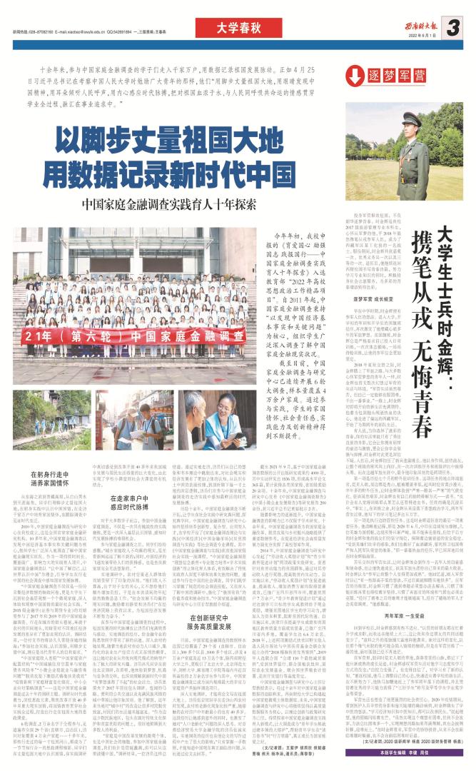 《以腳步丈量祖國(guó)大地 用數(shù)據(jù)記錄新時(shí)代中國(guó)——中國(guó)家庭金融調(diào)查實(shí)踐育人十年探索》由黨委宣傳部牽頭策劃,黨委宣傳部王春燕老師帶領(lǐng)學(xué)生團(tuán)隊(duì)共同采寫,經(jīng)濟(jì)與管理研究院蔣黎黎老師參與寫作,原文刊發(fā)于《西南財(cái)大報(bào)》第634期(2022年6月1日出版)。文章通過扎實(shí)的采訪和生動(dòng)的描寫,從“在躬身行走中涵養(yǎng)家國(guó)情懷”“在走家串戶中感應(yīng)時(shí)代脈搏”“在創(chuàng)新研究中服務(wù)高質(zhì)量發(fā)展”三個(gè)方面再現(xiàn)了10多年來中國(guó)家庭金融調(diào)查與研究中心組織廣大青年學(xué)子“用腳步丈量祖國(guó)大地,用數(shù)據(jù)記錄祖國(guó)發(fā)展脈動(dòng)”的實(shí)踐育人故事。