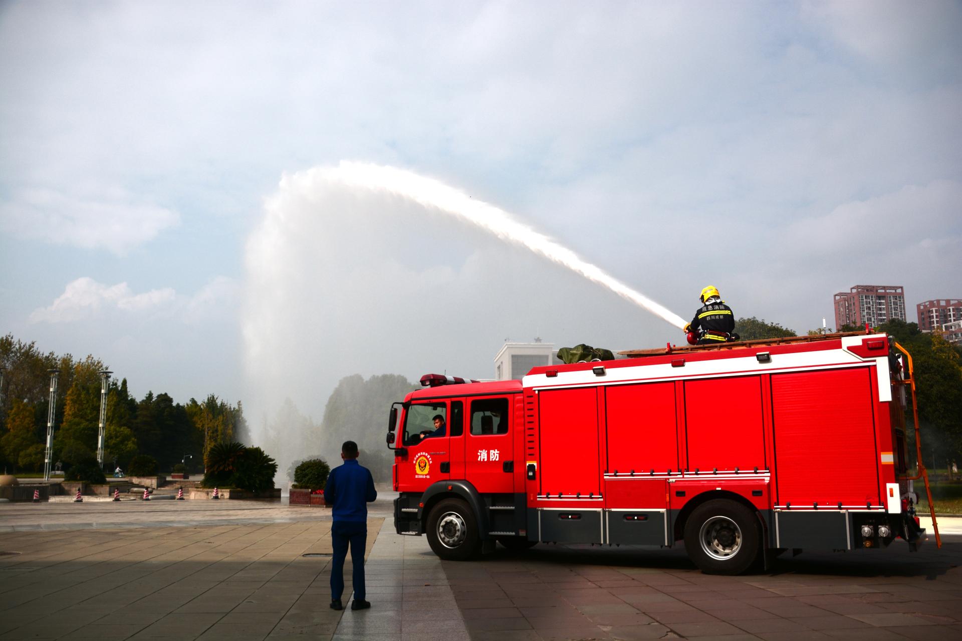 緊接著,消防車啟動十多米高的水柱,向濟民廣場中心進行滅火表演。觀摩表演之后,部分師生參與現場滅火演練,用干粉滅火器撲滅大火,掌握基本滅火技能。溫江消防中隊中隊長李林季對演練點評之后,總指揮宣布演習結束。