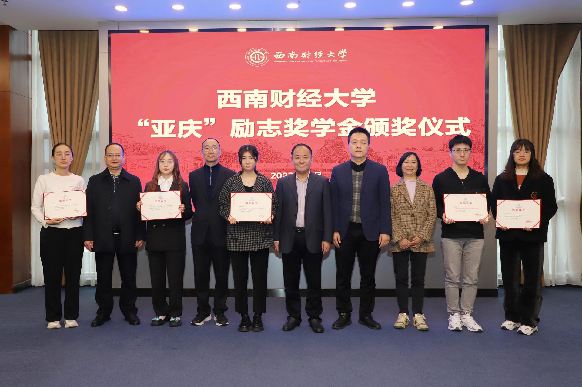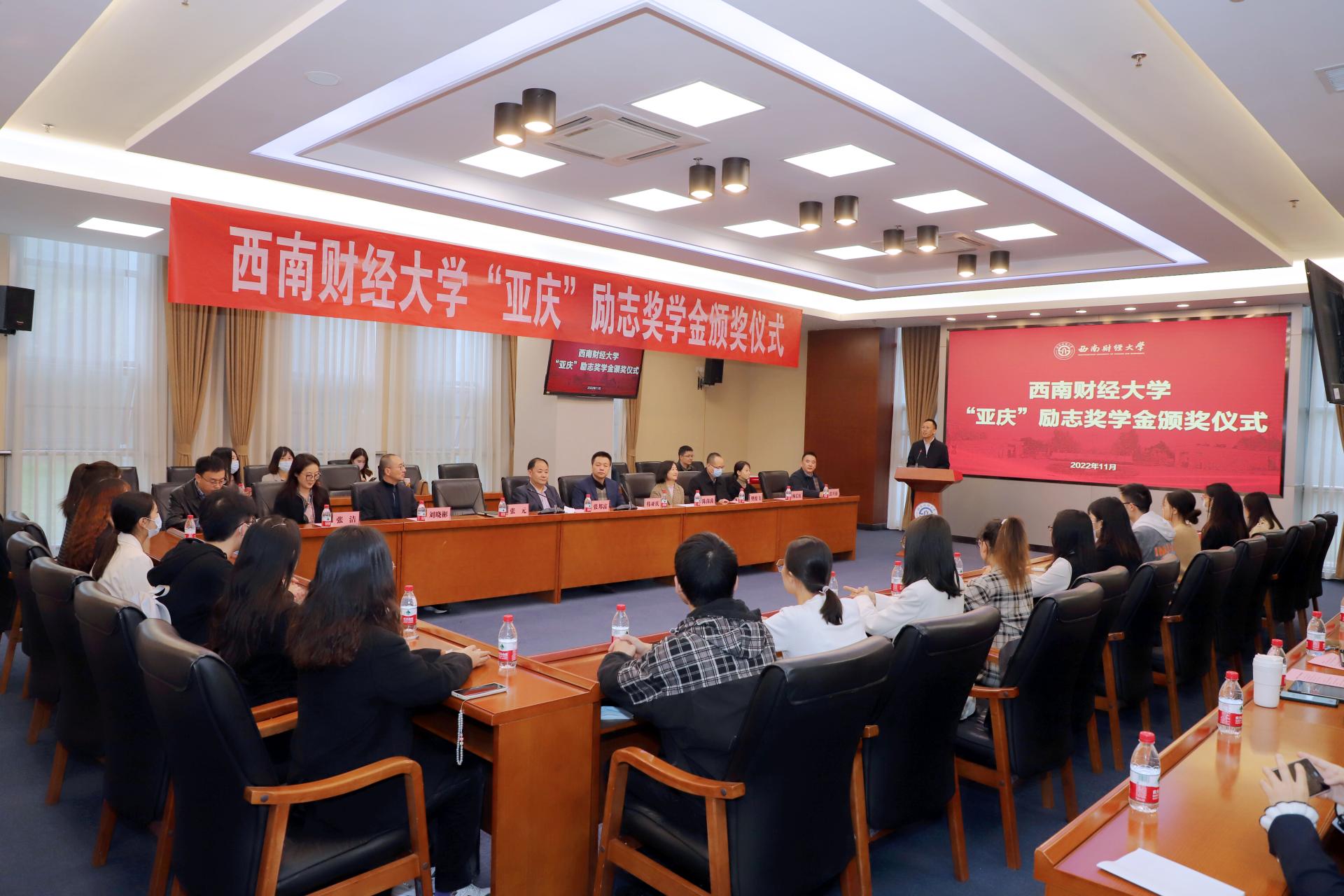 11月17日,2021-2022學年西南財經大學“亞慶”勵志獎學金頒獎儀式在柳林校區弘遠樓109會議室舉行。學校黨委常委、副校長張邦富,1993級校友、鵬華基金管理有限公司副總裁韓亞慶,校友工作辦公室、會計學院、數學學院相關代表及全體獲獎學生參加儀式。