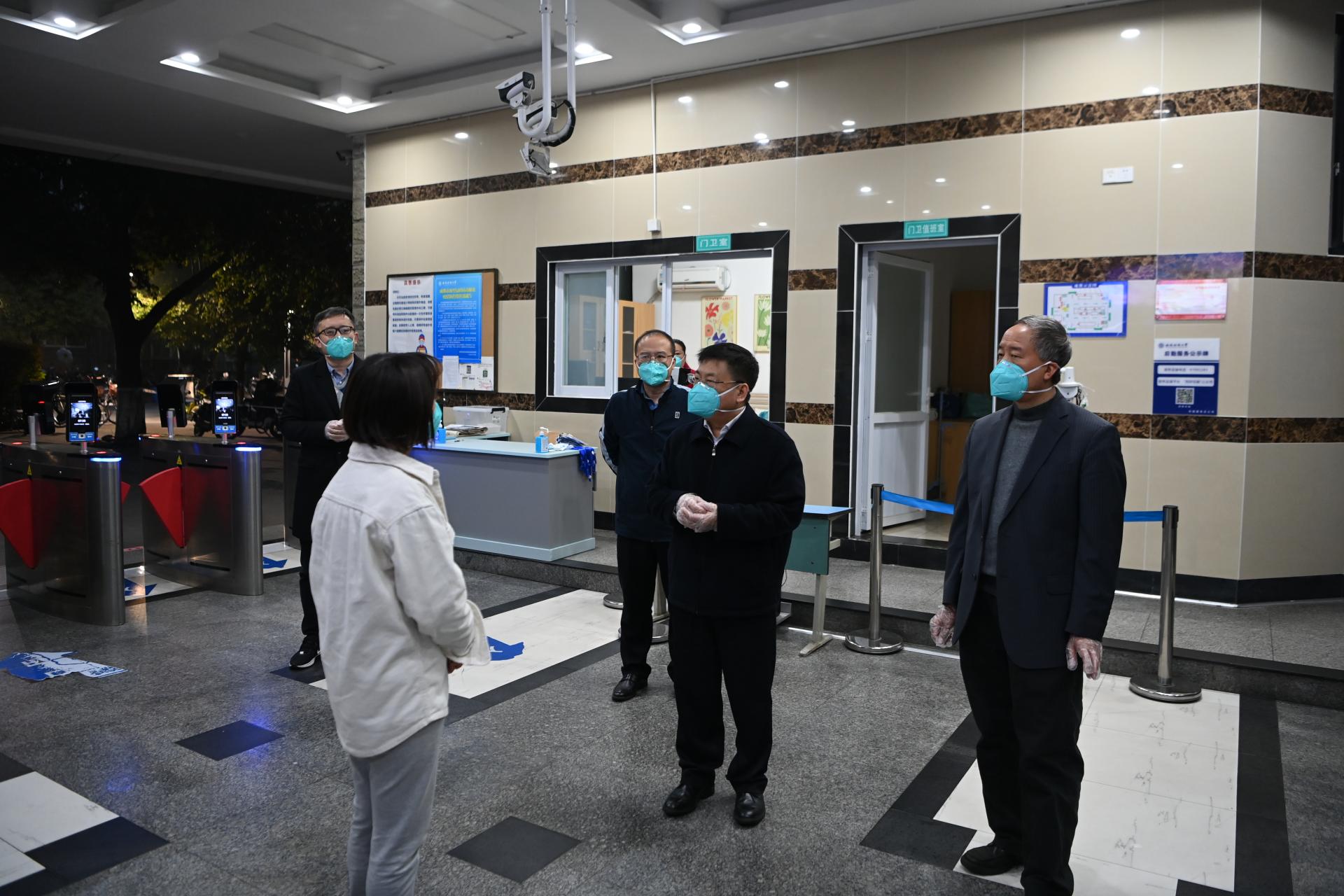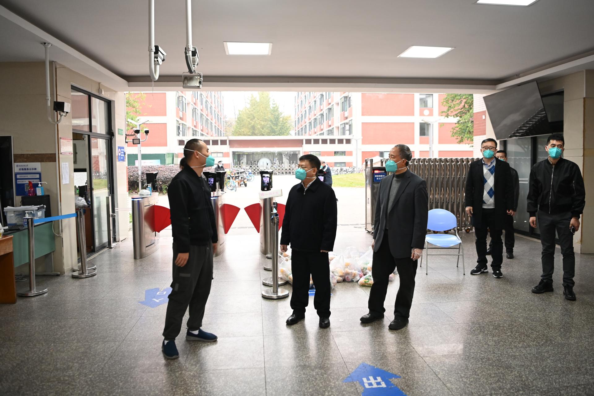 11月25日清晨,學校疫情防控工作領導小組組長、黨委書記趙德武和黨委副書記、校長卓志,領導小組辦公室主任、黨委副書記、副校長李永強一行深入柳林校區疫情防控一線指導檢查疫情防控工作開展情況,看望慰問堅守一線的工作人員。