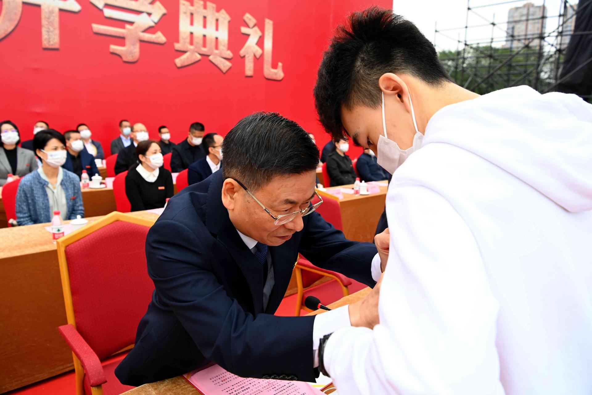典禮儀式上,劉立云和學校領導為新同學代表佩戴校徽,全體新同學現場集體佩戴校徽并莊嚴宣誓。