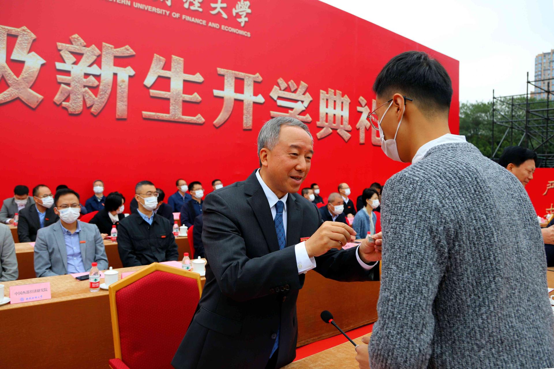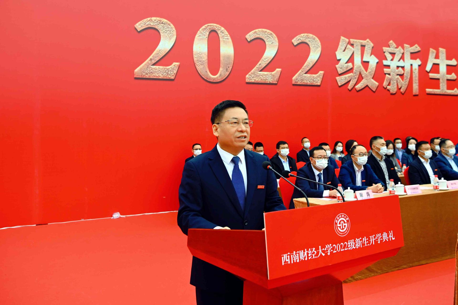 趙德武在主持典禮時深情回顧了西南財經大學97年走過的教育報國之路、團結奮進之路、追求卓越之路。他強調,黨的二十大召開在即,新時代西財人作為強國一代,生逢盛世、重任在肩,要堅定不移聽黨話、跟黨走,將個人理想追求與中華民族偉大復興緊緊相連,不負韶華、不負時代、不負人民,永葆青春理想,傳承西財精神,在青春的賽道上跑出當代青年的最好成績。他寄語全體新同學,要堅定理想信念,高擎信仰之炬,牢固樹立共產主義遠大理想和中國特色社會主義共同理想,自覺在學懂弄通習近平新時代中國特色社會主義思想上下功夫,自覺做“兩個確立”的堅決擁護者和“兩個維護”的堅定踐行者。要勤學善思篤行,勇攀知識之巔,以做大學問、做真學問為志向,持之以恒鉆研世界學術前沿和國家發展需求的真問題,在破解“卡脖子”問題上下苦功、練真功,把個人的“小我”融入到實現“國家富強,民族復興,人民幸福”的“大我”之中,創造無愧于時代和人民的業績。要勇于拼搏創新,點亮奮斗之光,在學習生活中奮勇爭先,在急難險重任務中沖鋒在前,在基層一線經受磨礪,在真刀真槍的鍛造中攻堅克難、磨礪意志、堅定信念,用行動擦亮奮斗這個青春最亮麗的底色。要傳承西財精神,共襄百年之業,用心感悟“百年西財”的歷史傳統、精神文化、名師大家和奮進力量,與學校共奮進、同成長,在回望百年輝煌、傳承西財精神中凝聚走向未來的力量。趙德武祝愿新同學們在新時代新征程中,大氣為人、大智謀事、大愛行天下,充分釋放最富挑戰性的創造力,以最好的青春、最美的奮斗,闊步邁向屬于每一個西財人的理想彼岸和廣闊未來。