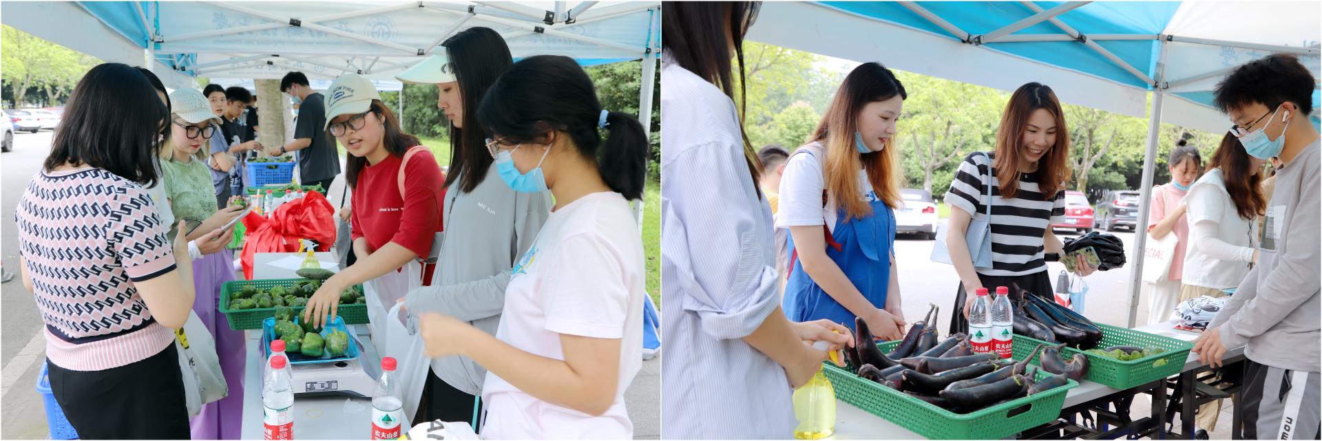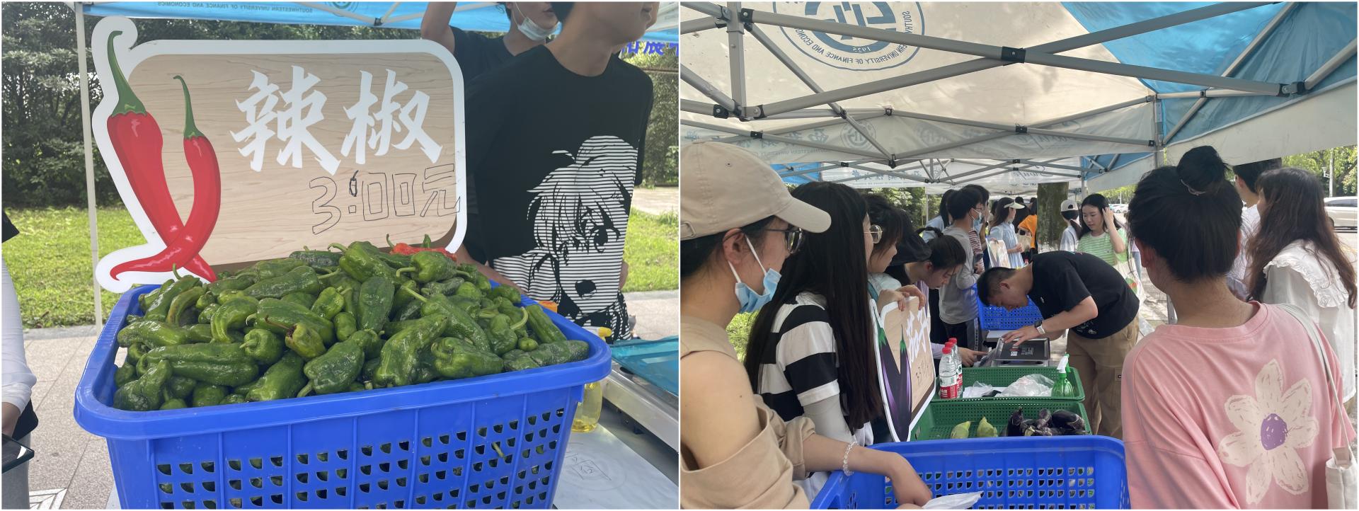 采摘結束后,學生們將一筐筐蔬菜運送到“SWUFE勞動集市”售賣。集市上,各學院(研究院)精心布置的蔬菜攤位依次排開,學生們紛紛變身“營業員”,向全校師生推銷自己家的農產品。一時間,熱鬧的集市上人頭涌動,各類叫賣聲此起彼伏,15個培養單位集中售賣的綠色無公害蔬菜在一個小時里被搶購一空。當日,在一粟堂二樓,學校專門開設“耕讀田園”豐收季美食窗口前也排起了長龍,收獲的蔬菜被做成各色美味菜式,受到了師生們的廣泛歡迎。