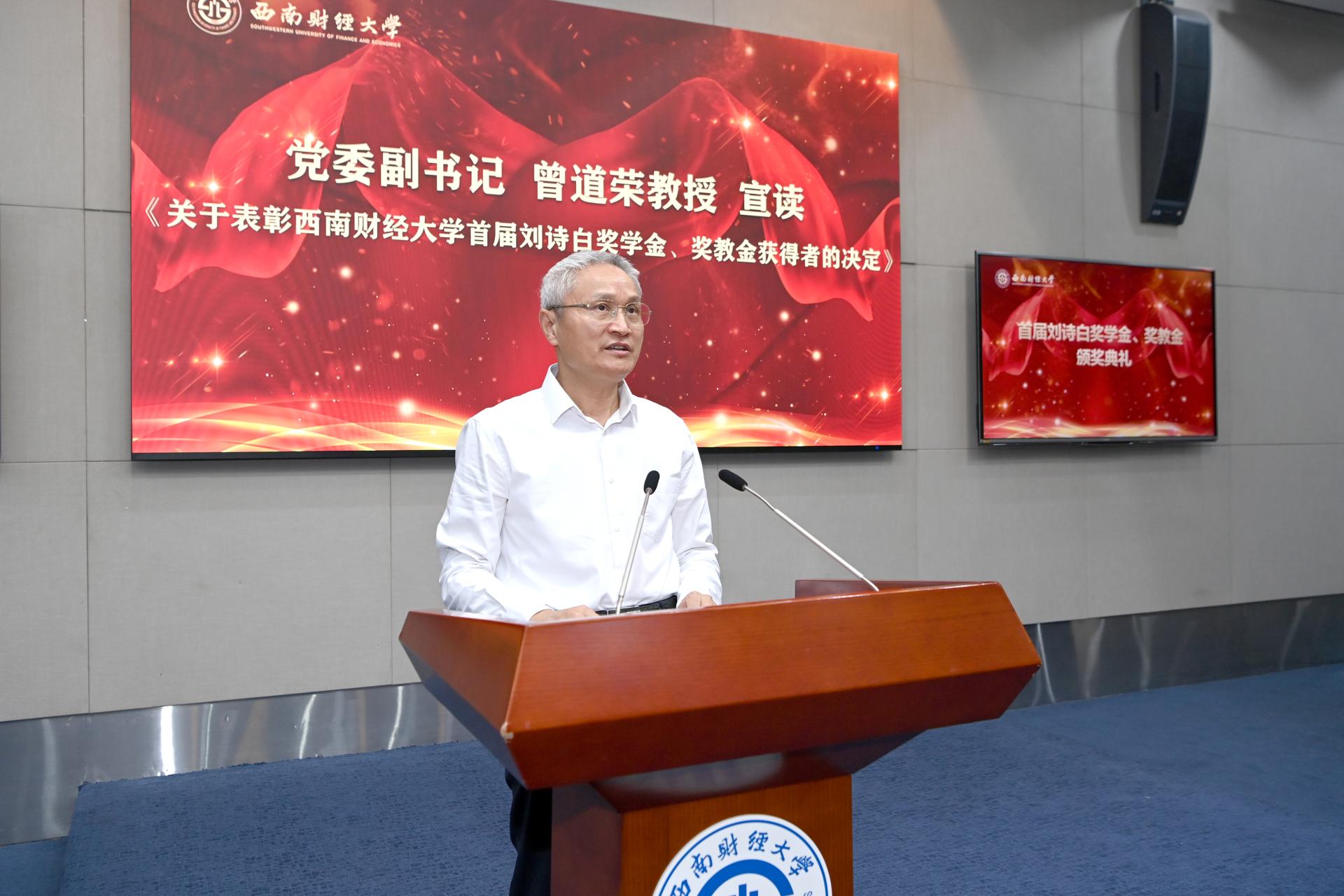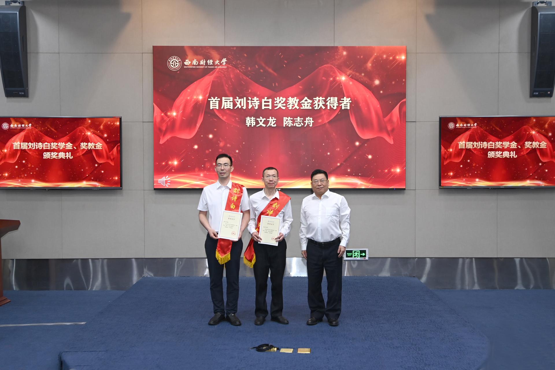 6月15日上午,西南財經大學首屆劉詩白獎學金、獎教金頒獎典禮在弘遠樓101會議室隆重舉行。黨委書記趙德武教授,黨委副書記、校長卓志教授,黨委副書記曾道榮教授,黨委常委、副校長李永強教授,原副校長劉燦教授,原副校長丁任重教授,學校相關職能部門負責人,獲獎教師和獲獎學生參加典禮。李永強主持典禮。