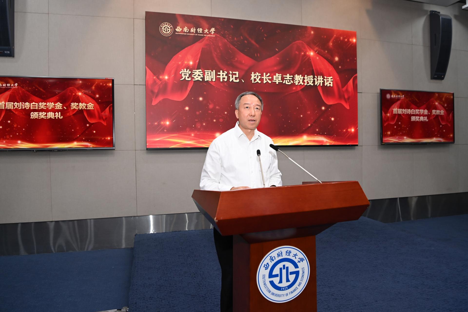 卓志代表學校向獲獎教師和學生致以衷心祝賀。卓志表示,劉詩白教授是理論經濟學研究方面的名師大家,是我國社會主義市場經濟理論研究的先驅者,也是人文社科和高等財經教育戰(zhàn)線上的“大先生”。詩白先生的精神品格早已與西財緊緊融嵌在一起,成為西財名師大家文化的重要組成部分。希望同學們自覺傳承和弘揚詩白先生等老一輩西財學者的崇高信念、家國情懷、治學品格、精神境界,努力成為堪當民族復興重任的時代新人;希望老師們堅持以馬克思主義為指導,扎根中國大地做學問,聚焦黨和國家重大理論和現(xiàn)實問題,恪守德馨品高、行為世范,做學生為學、為事、為人的大先生。
