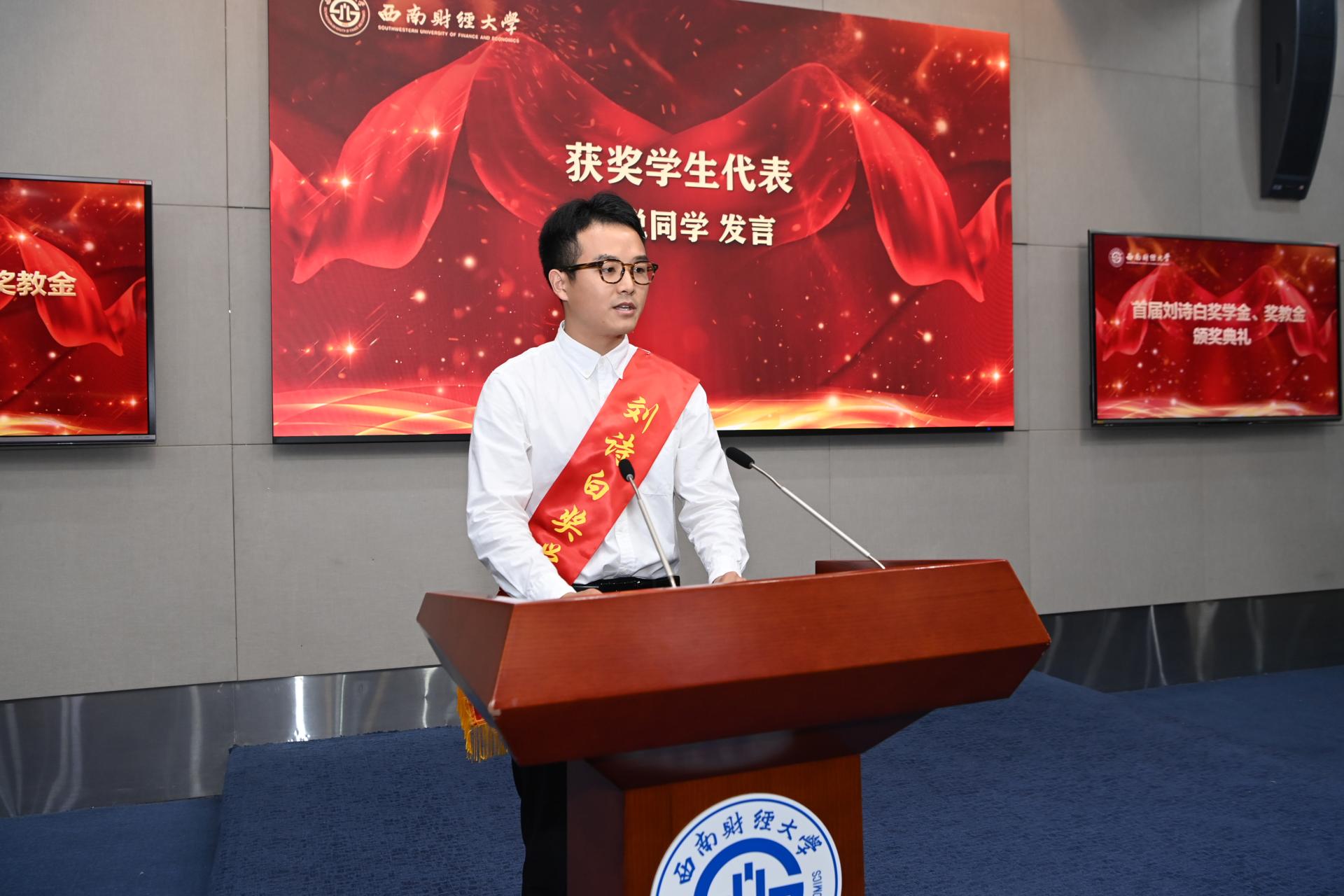 曾道榮宣讀了表彰西南財經大學首屆劉詩白獎學金、獎教金獲得者的決定。獲獎教師代表韓文龍發(fā)言表示,將賡續(xù)馬克思主義政治經濟學的“紅色基因”,潛心治學,以德施教,成為塑造學生品格、品行、品味的引路人。獲獎學生代表劉銳代表西財學子向劉詩白教授致以崇高敬意,對母校的悉心培養(yǎng)表達了誠摯的感謝,他用“澆灌夢想”“追逐夢想”“賡續(xù)夢想”三個關鍵詞分享了自己在西財?shù)某砷L故事。