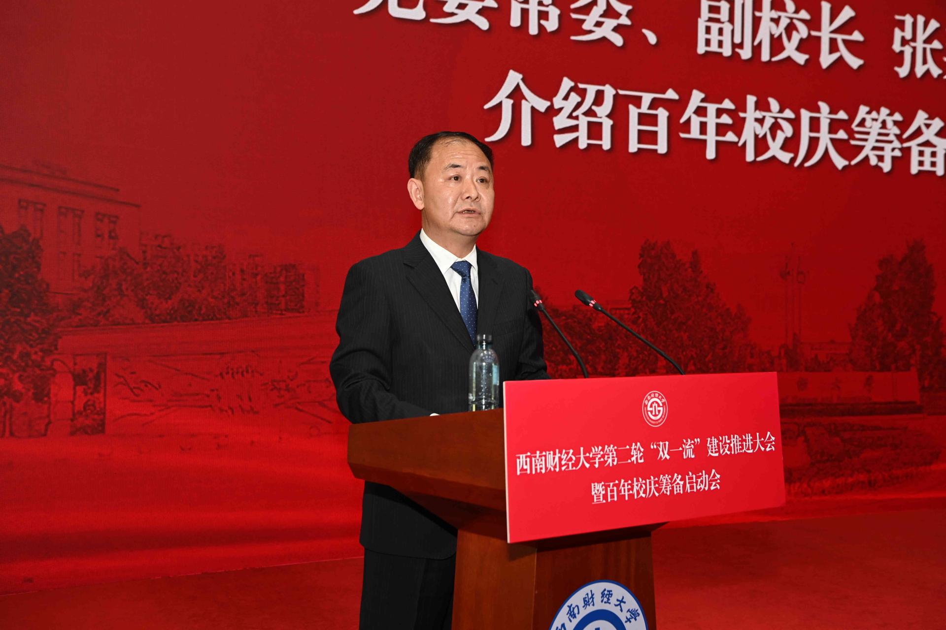 黨委副書記、校長卓志以《扎根中國大地 勇?lián)耸姑?服務國之大者 加快建設財經(jīng)特色鮮明的世界一流大學》為題作報告。他誠摯感謝全體西財人對學校首輪“雙一流”建設的辛勤付出,回顧了學校首輪“雙一流”建設的成效,介紹了第二輪“雙一流”建設的進展,從五個方面對深入推進第二輪“雙一流”建設作出部署安排。卓志指出,立足新時代新征程,第二輪“雙一流”建設使命光榮、任重道遠,要深刻認識第二輪“雙一流”建設的重大意義,自覺貫徹落實黨中央決策部署,推進高等財經(jīng)教育創(chuàng)新發(fā)展,為“百年西財”奠定堅實基礎。要領會把握第二輪“雙一流”建設的鮮明導向,更加突出培養(yǎng)一流人才,更加突出服務國家戰(zhàn)略需求,更加突出爭創(chuàng)世界一流,奮力推進新時代高等財經(jīng)教育高質量發(fā)展。要精準明晰第二輪“雙一流”建設的目標要求,把堅持和加強黨的全面領導作為根本保證,把主動服務國家重大戰(zhàn)略作為最高追求,把建設“新財經(jīng)”作為創(chuàng)新發(fā)展的戰(zhàn)略引領,把質量提升內涵發(fā)展作為基本路徑,把深化體制機制綜合改革作為重要動力,奮力書寫新時代高等財經(jīng)教育創(chuàng)新發(fā)展“奮進之筆”。要全力落實第二輪“雙一流”建設的任務舉措,著力提升學生全面發(fā)展力、學者綜合競爭力、學術服務貢獻力、學科國際影響力、西財文化軟實力。要齊心協(xié)力共創(chuàng)一流,提高政治站位、著眼大局謀發(fā)展,發(fā)揚奮斗精神、凝心聚力抓落實,堅持穩(wěn)中求進、久久為功創(chuàng)一流,以好的建設成效接受黨和國家以及全體西財人的檢閱。卓志強調,站在新的歷史起點,全體西財人要團結奮進、主動作為、攻堅克難,全力推進第二輪“雙一流”建設,加快建設財經(jīng)特色鮮明的世界一流大學,為建設社會主義現(xiàn)代化強國作出新的更大貢獻。