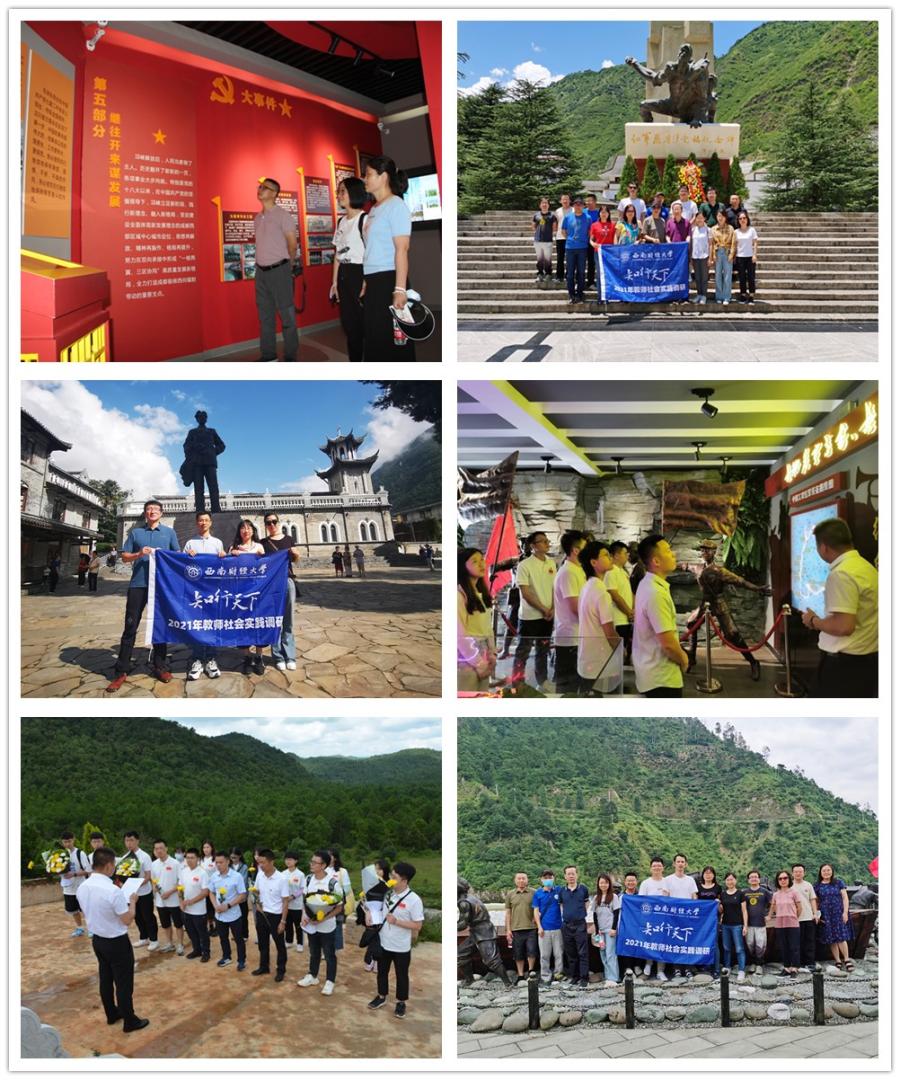項目團隊教師將理想信念教育融入社會實踐,深入學習偉大建黨精神,感悟革命傳統,堅定做紅色基因的忠實傳承者和實踐者。保險學院“重溫黨史,踐行初心,金融知識進鄉村”項目團隊教師前往邛崍紅軍長征紀念館進行參觀學習,深入了解邛崍黨組織建立發展歷程,重溫革命先輩的英勇事跡與戰斗生活,感悟革命精神,汲取奮進力量。工商管理學院“生態文化資源在鄉村振興中的探索”項目調研團隊前往云南省曲靖市富源縣參觀墨紅鎮普沖紅色教育基地,祭奠英烈,重溫入黨誓詞。中國西部經濟研究中心“四川省農村綠色普惠金融發展路徑研究”項目調研團隊在瀘定縣磨西紅軍長征紀念館、毛主席住地舊址、紅軍飛奪瀘定橋紀念館開展黨史學習教育研學活動,追尋紅色足跡,感悟初心使命,堅定理想信念。