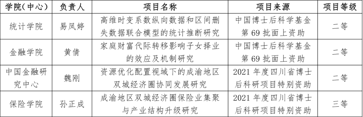 日前,中國博士后科學基金第 69 批面上資助、2021 年度四川省博士后科研項目特別資助名單公布,我校4名博士后獲得項目立項。