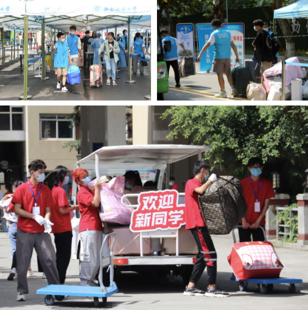 修繕一新的校園環境,一花一木的精心點綴,整潔明亮的學生公寓,高效便捷的報到流程……迎新工作的一點一滴都承載著學校對新生的暖心關懷。暑熱未褪,防疫工作人員身著悶熱的隔離服一絲不茍地為每一位同學檢測體溫、消毒行李、更換口罩,精心呵護著大家的生命安全與身體健康;一輛輛滿載新同學和行李箱的擺渡車、搬運車穿梭校園,幫助新同學們輕松抵達目的地;身著“西財藍”“志愿紅”的迎新志愿者忙著為學弟學妹們提供指引、派發物資、搬運行李;后勤服務總公司貼心地為大家準備了牛奶、面包、礦泉水等愛心便餐包,保障同學們等待核酸檢測結果時的正常飲食……全體教職員工齊心協力為新生入學保駕護航,讓新同學們深切體會到西財大家庭的和諧溫暖。