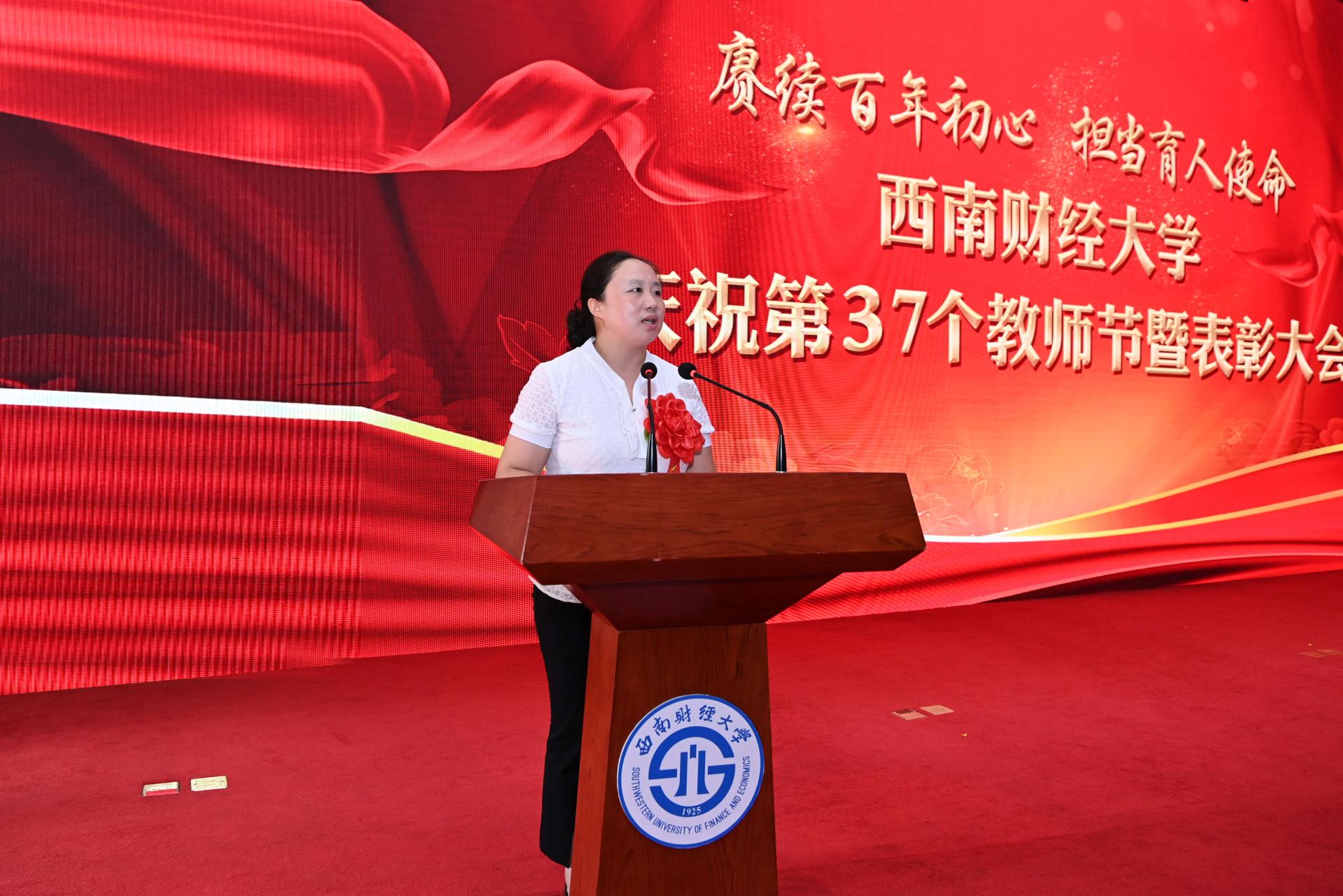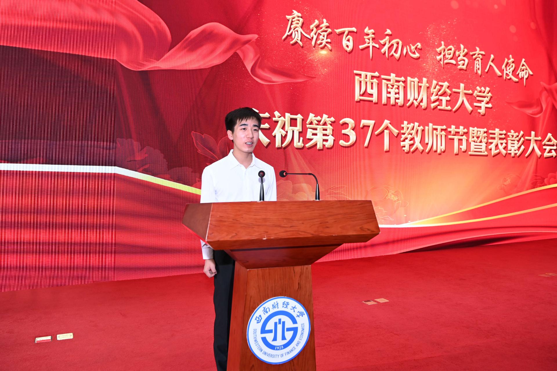 會(huì)上,學(xué)生代表李齊民宣讀賀信,感恩全體教師的辛勤付出,并獻(xiàn)上崇高敬意和誠(chéng)摯祝福,立志踐行請(qǐng)黨放心、強(qiáng)國(guó)有我的青春誓言,將“經(jīng)世濟(jì)民、孜孜以求”的西財(cái)精神播撒四方。