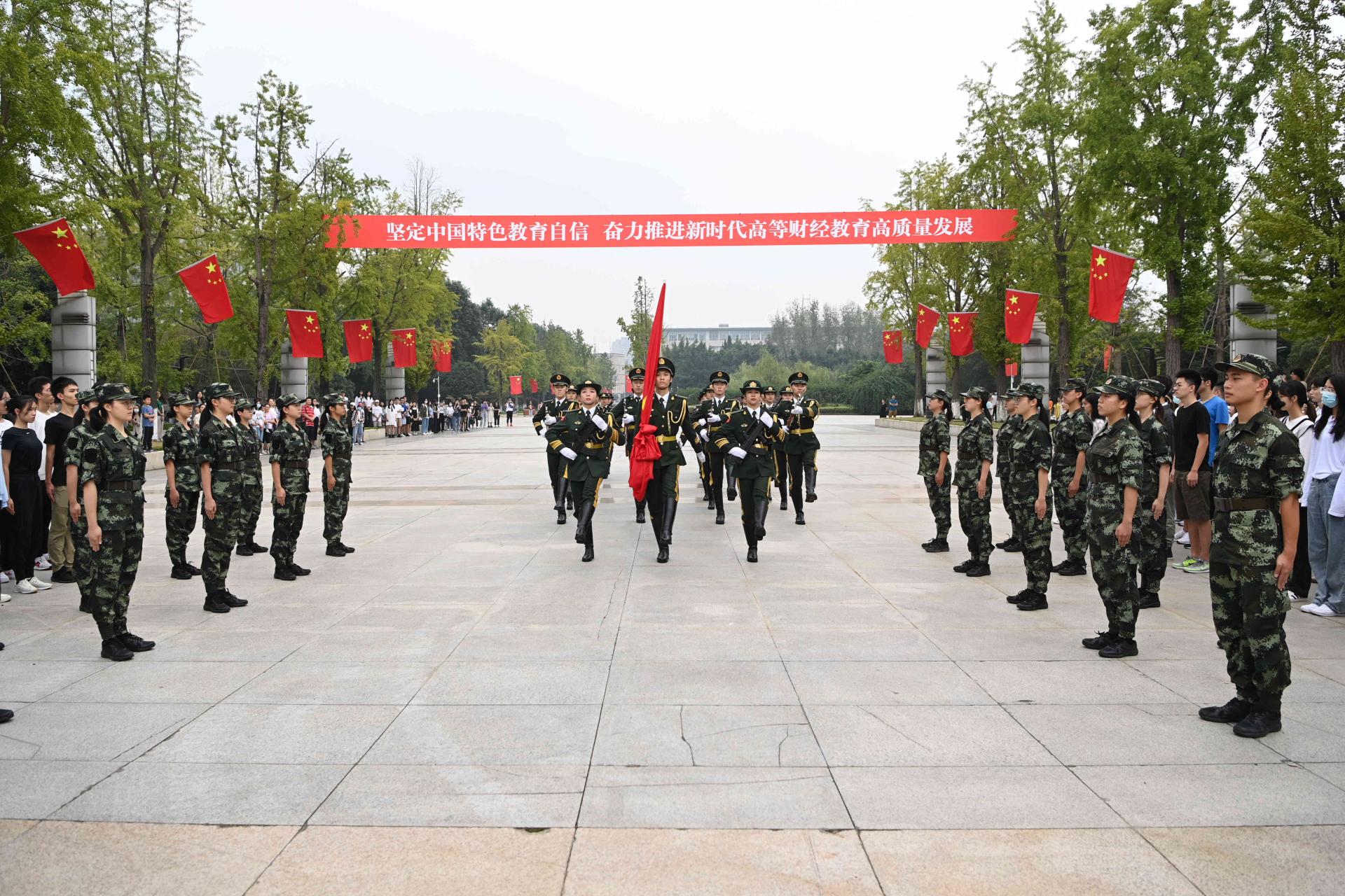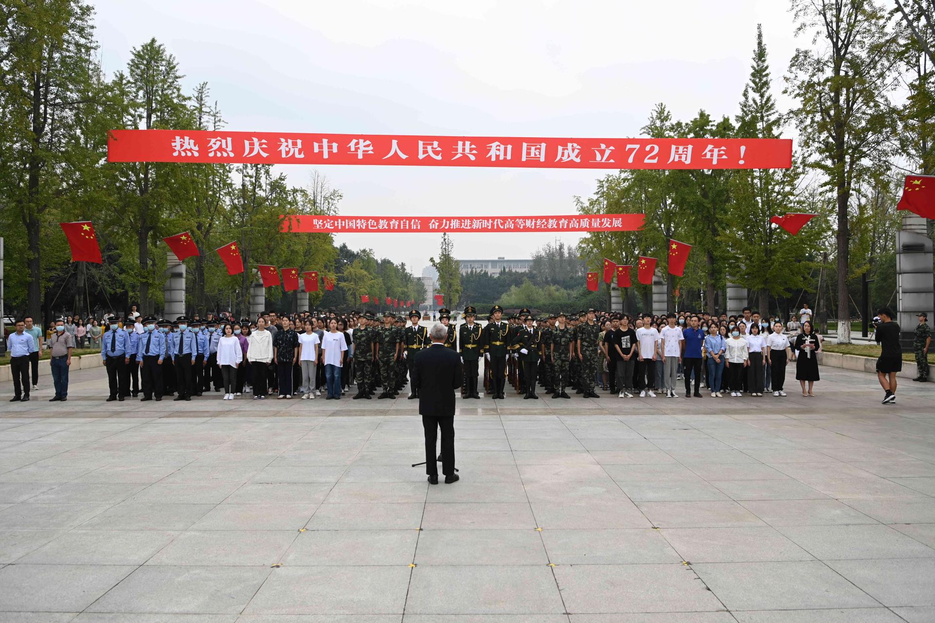 家有山河錦繡,國有歲月芳華。10月1日清晨,學校慶祝中華人民共和國成立72周年升國旗儀式在柳林校區、光華校區隆重舉行。200余名西財師生懷著激動而喜悅的心情,齊聚兩校區升旗臺,向偉大祖國獻禮,與全國人民一道為新中國慶賀生日。黨委副書記曾道榮與法學院、國際商學院師生代表,國旗班成員和校衛隊員等參加了柳林校區升國旗儀式;黨委常委、副校長歐兵與保險學院、統計學院、繼續(網絡)教育學院師生及校衛隊員等參加了光華校區升國旗儀式。相關職能部門和學院負責人主持升國旗儀式。