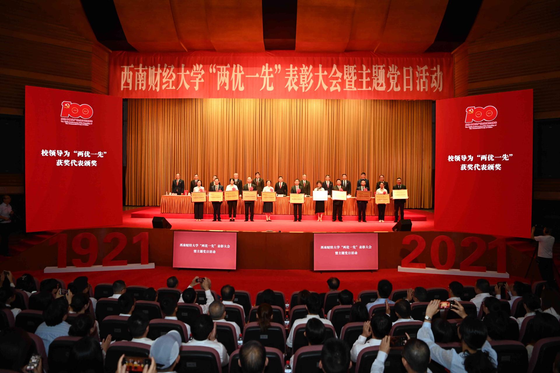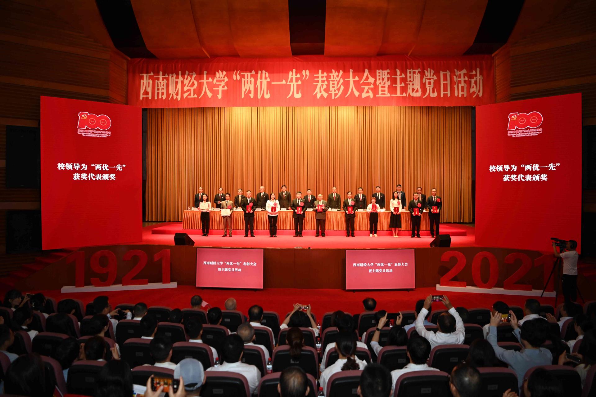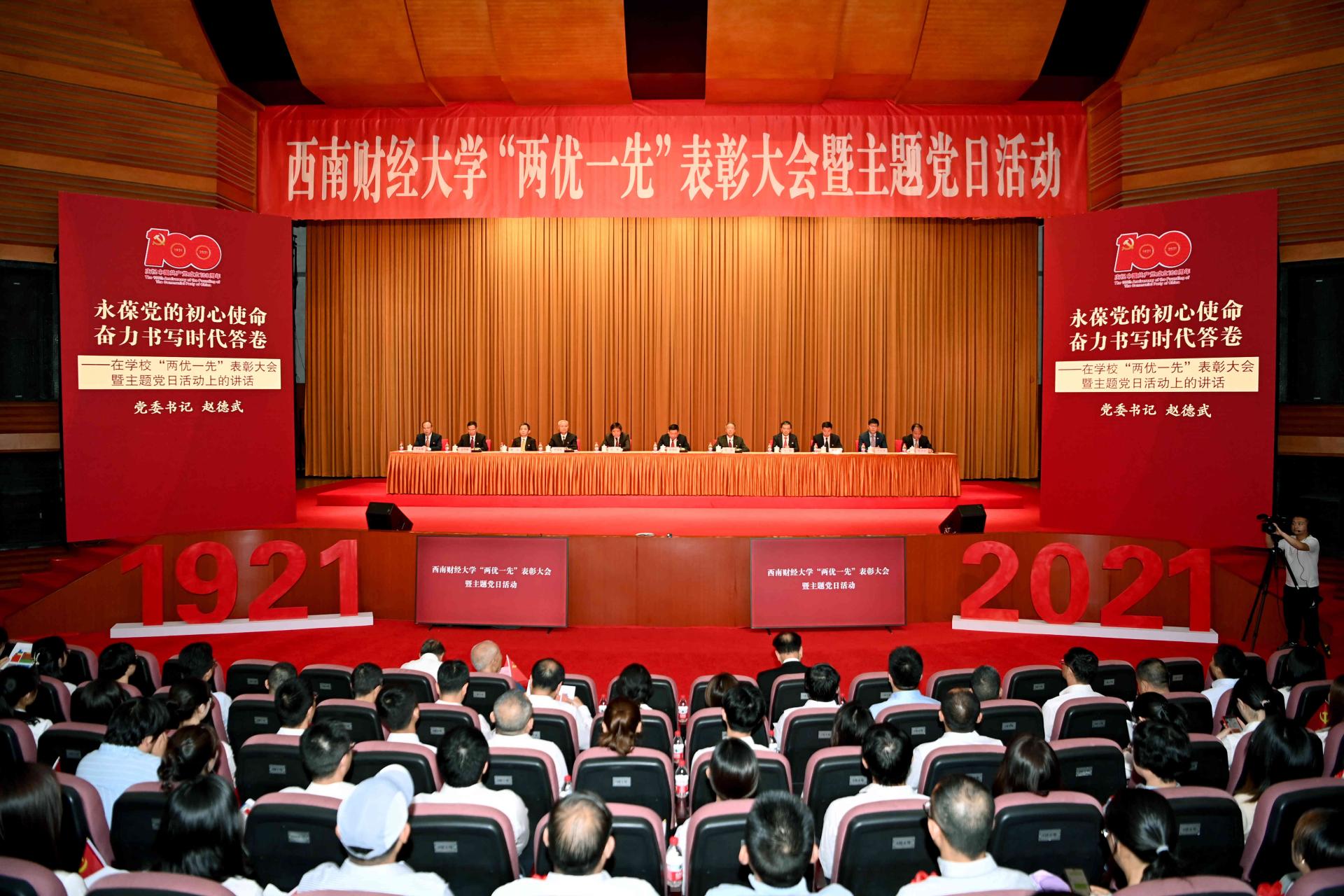百年大黨恰風華,砥礪初心向復興!6月30日,西南財經大學柳林校區大學生活動中心禮堂氣氛莊重熱烈。學校在此隆重舉行“兩優一先”表彰大會暨“奮斗百年路 啟航新征程”主題黨日活動,慶祝中國共產黨成立100周年,回顧中國共產黨百年奮斗的光輝歷程,表彰優秀共產黨員、優秀黨務工作者和先進基層黨組織,表彰新冠疫情防控中的先進集體和先進個人,舉行主題黨日活動和新黨員入黨宣誓、老黨員重溫入黨誓詞,動員全校黨員干部和師生員工立足“兩個大局”,心懷“國之大者”,永葆黨的初心使命,奮力書寫時代答卷,為建設財經特色鮮明的世界一流大學,為加快實現教育現代化、建設高等教育強國,為建設社會主義現代化強國而努力奮斗。全體校領導,學校老領導,黨委委員、紀委委員,全體中層干部,“兩優一先”代表,抗擊新冠肺炎疫情工作優秀團隊和優秀個人代表,學校第十三次黨代會代表,學校特聘組織員,各分黨委、黨總支、直屬黨支部專職組織員,教工黨支部書記、學生黨支部書記代表,師生黨員代表參加大會。黨委書記趙德武講話,黨委副書記、校長卓志主持表彰大會。