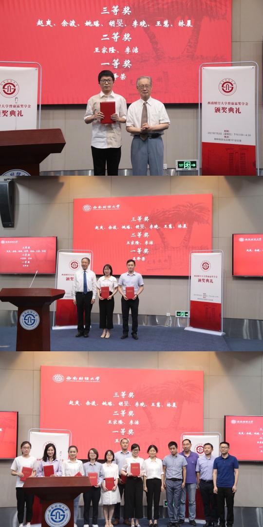 尹慶雙宣讀了《關(guān)于表彰西南財(cái)經(jīng)大學(xué)第六屆曾康霖獎(jiǎng)學(xué)金獲得者的決定》,鼓勵(lì)獲獎(jiǎng)學(xué)生再接再厲,在金融學(xué)科研究中取得更大成果。他希望全體同學(xué)以獲獎(jiǎng)同學(xué)為榜樣,在金融學(xué)科的星辰大海中與時(shí)俱進(jìn),不斷跋涉學(xué)術(shù)思想的高峰。曾康霖、卓志、各學(xué)院(中心)負(fù)責(zé)人及獲獎(jiǎng)學(xué)生導(dǎo)師一同為獲得本次獎(jiǎng)學(xué)金的同學(xué)頒獎(jiǎng)。金融學(xué)院副院長(zhǎng)羅榮華介紹了本次獎(jiǎng)學(xué)金評(píng)審情況。