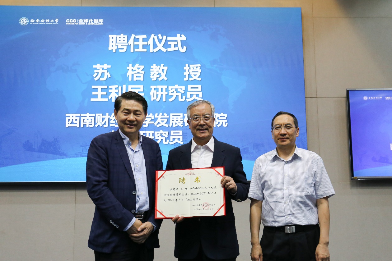 黨委常委、副校長史代敏教授與王輝耀為蘇格教授、王利民研究員頒發發展研究院特聘研究員聘書。