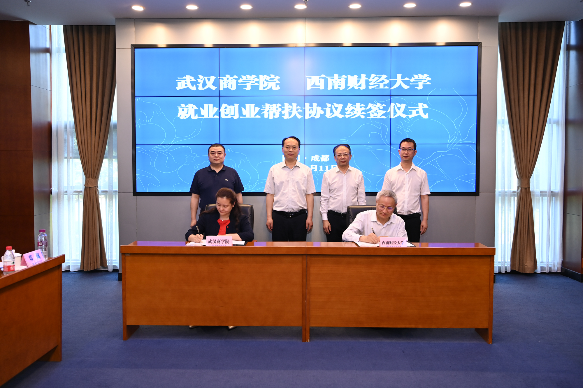 5月11日上午,西南財經大學與武漢商學院就業創業幫扶協議續簽儀式在柳林校區弘遠樓109會議室舉行。校黨委副書記曾道榮、武漢商學院副校長劉佳霓代表兩校簽訂了協議。湖北省教育廳副廳長張金元、四川省教育廳副廳長戴作安及相關負責同志見證了簽約儀式。