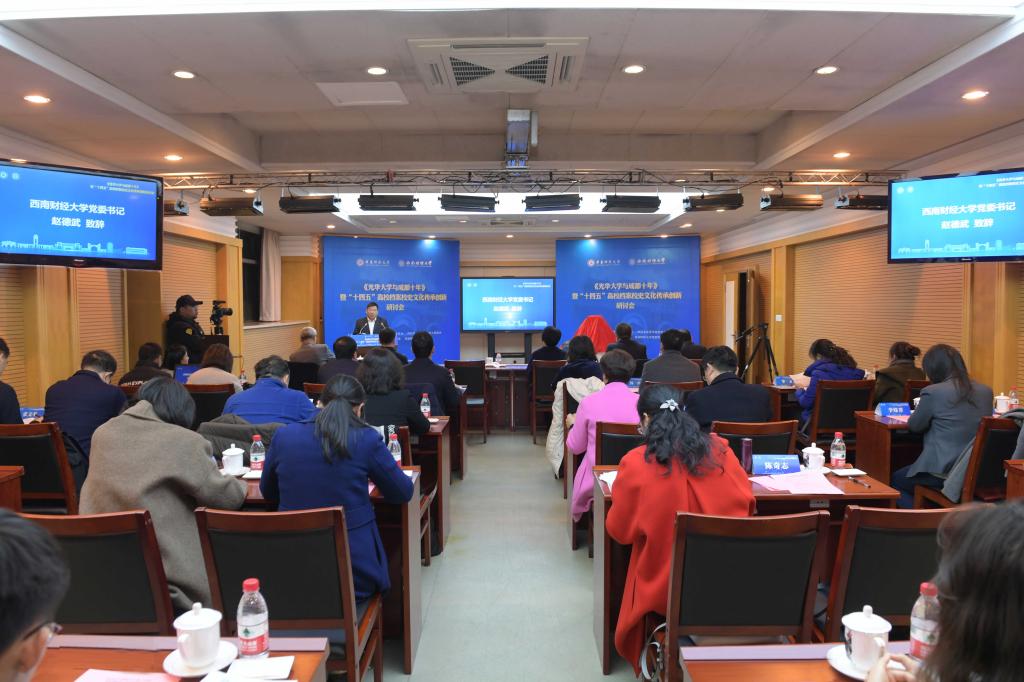 12月5日,由上海檔案學會高校檔案專業委員會、四川省高等學校檔案工作協會主辦,西南財經大學檔案館、華東師范大學檔案館聯合承辦的《光華大學與成都十年》暨“十四五”高校檔案校史文化傳承創新研討會在柳林校區騰驤樓101會議室召開。華東師范大學黨委書記梅兵,黨委常委、副校長孫真榮,黨委常委、組織部長程靜,四川省檔案館副館長周書生;我校黨委書記趙德武,黨委副書記曾道榮,黨委常委、副校長史代敏,滬蓉兩地檔案(校史)專家、師生代表參加會議。曾道榮主持會議。