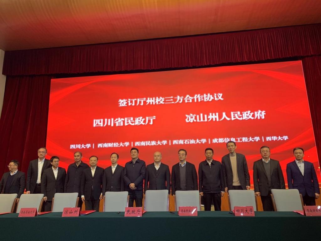 馬驍一行在昭覺縣參加了涼山州異地扶貧搬遷集中安置點(diǎn)治理發(fā)展推進(jìn)會,并參與“彝路相伴”廳州校三方合作協(xié)議的簽訂儀式。省委常委、組織部部長王正譜,省政協(xié)副主席、涼山州委書記林書成,省民政廳黨組書記、廳長益西達(dá)瓦,省教育廳黨組書記、廳長李江以及四川大學(xué)等兄弟高校的負(fù)責(zé)人出席。