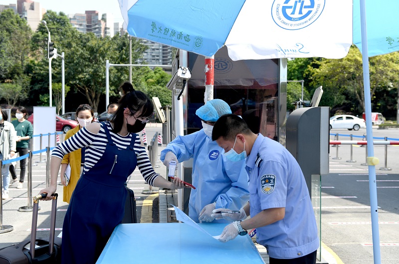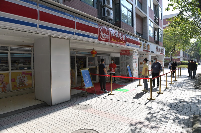 在演練現場,隨處可見清晰明顯的提示展板和耐心解答的工作人員,參加演練的人員根據引導有序排隊、積極配合。柳林校區南大門外,演練人員根據展板提示主動出示健康二維碼,配合工作人員完成行程查驗、行李消毒和口罩更換,間隔排隊進入熱成像體溫篩查區測量體溫,如實進行流行病學調查登記,領取學校精心準備的防疫物資“愛心包”并進入校園。梅園學生公寓門口,熱情的樓媽們站成一排迎接久別重逢的同學,學生們依次間隔排隊進行身份驗證、健康卡復核和體溫檢測。在經世樓教室,同學們嚴格遵守單向通行和隔位就坐,認真學習返校開學第一課。在五谷堂,同學們按照“七步洗手法”完成餐前清潔,在“回”字形通道間隔排隊錯峰購餐。超市門口,前來購物的同學間隔排隊、主動消毒,工作人員及時有效控制進入超市內人數,引導學生有序購物。