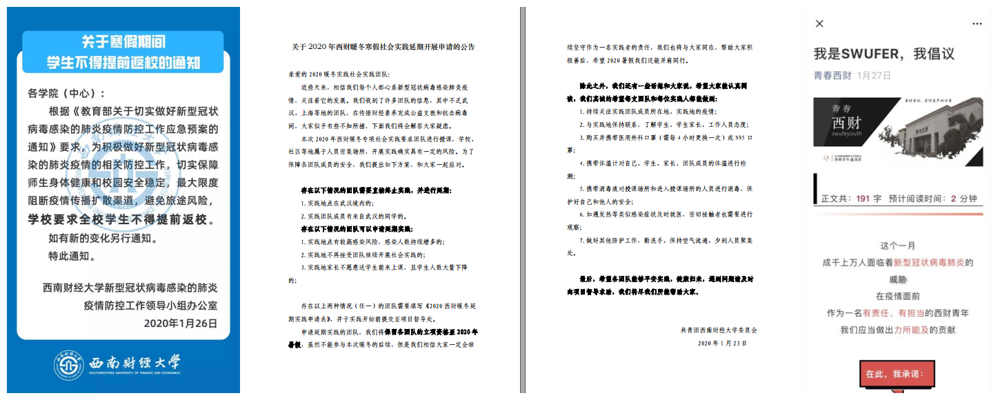 全員聯(lián)動(dòng),宣傳科普廣覆蓋。積極通過微信公眾號(hào)、網(wǎng)頁、學(xué)生QQ群與微信群等,開展科普宣傳、學(xué)生關(guān)愛教育和引導(dǎo)教育,及時(shí)將學(xué)校的關(guān)心關(guān)愛、學(xué)校的安排和要求轉(zhuǎn)達(dá)給每位西財(cái)學(xué)生,帶領(lǐng)學(xué)生打贏防疫戰(zhàn)。學(xué)校疫情防控領(lǐng)導(dǎo)小組及時(shí)發(fā)布《關(guān)于全面暫停我校2020年西財(cái)社會(huì)實(shí)踐的通知》《關(guān)于寒假期間學(xué)生不得提前返校的通知》等疫情防控通知,做好疫情防控期間的學(xué)生事務(wù)服務(wù),最大限度阻斷疫情傳播擴(kuò)散渠道。以輔導(dǎo)員關(guān)懷、學(xué)生自我教育、典型引領(lǐng)示范的方式,引導(dǎo)學(xué)生加強(qiáng)自我保護(hù),理性辨別謠言,傳播正能量。發(fā)起“我是SWUFER,我倡議”,號(hào)召全校學(xué)生齊心協(xié)力,共克時(shí)艱,近13000余人參與。