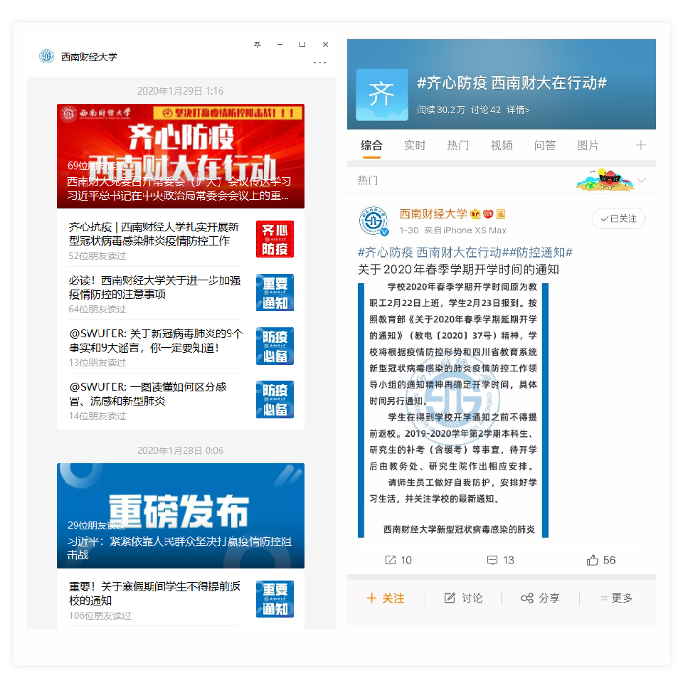1月29日,學(xué)校發(fā)布《致全體西財(cái)校友的慰問信》,鼓勵(lì)大家堅(jiān)定必勝信心,共同打贏新型冠狀病毒感染的肺炎疫情防控阻擊戰(zhàn)。