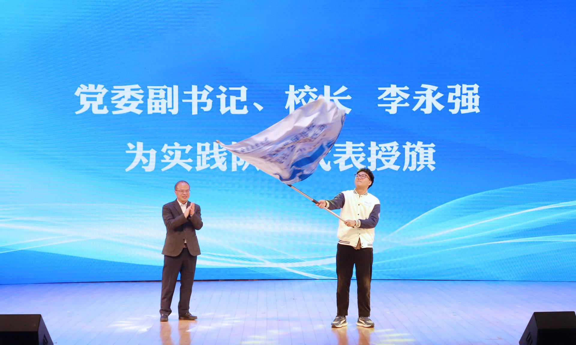 啟動儀式上,李永強(qiáng)為第七屆“把西財帶回母校”寒假社會實踐隊伍學(xué)生代表授旗。