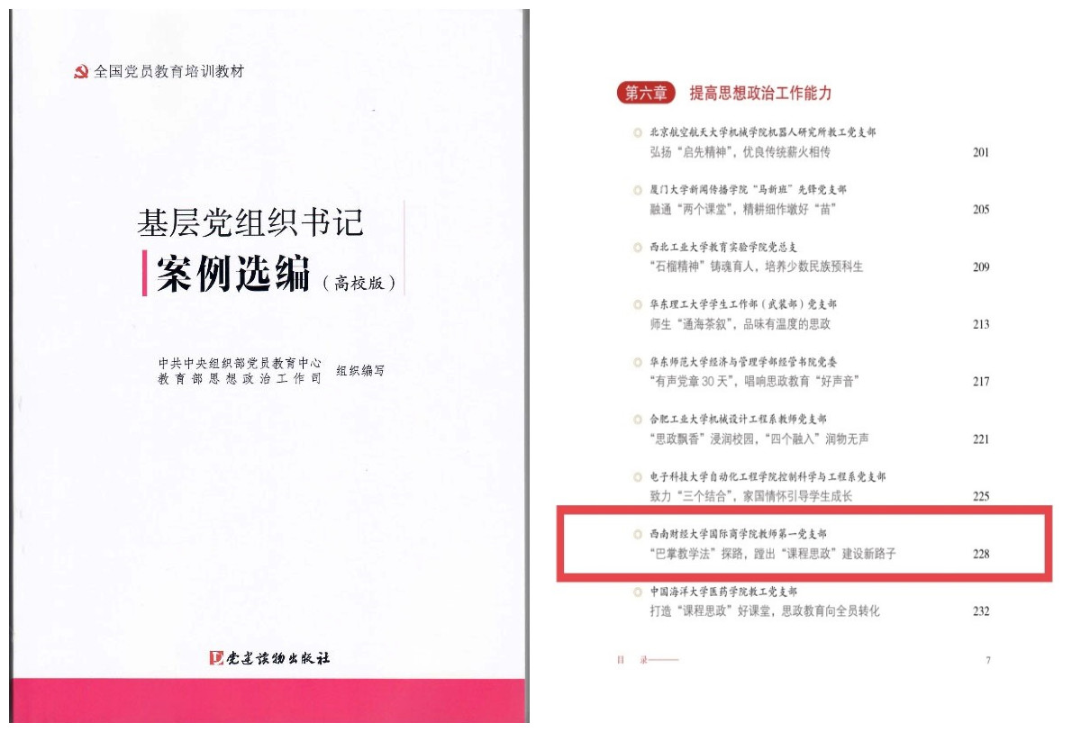 近日,由中央組織部黨員教育中心、教育部思想政治工作司組織編寫的《基層黨組織書記案例選編(高校版)》正式出版發(fā)行。我校國際商學(xué)院教師第一黨支部書記工作案例《“巴掌教學(xué)法”探路,蹚出“課程思政”建設(shè)新思路》入選。
