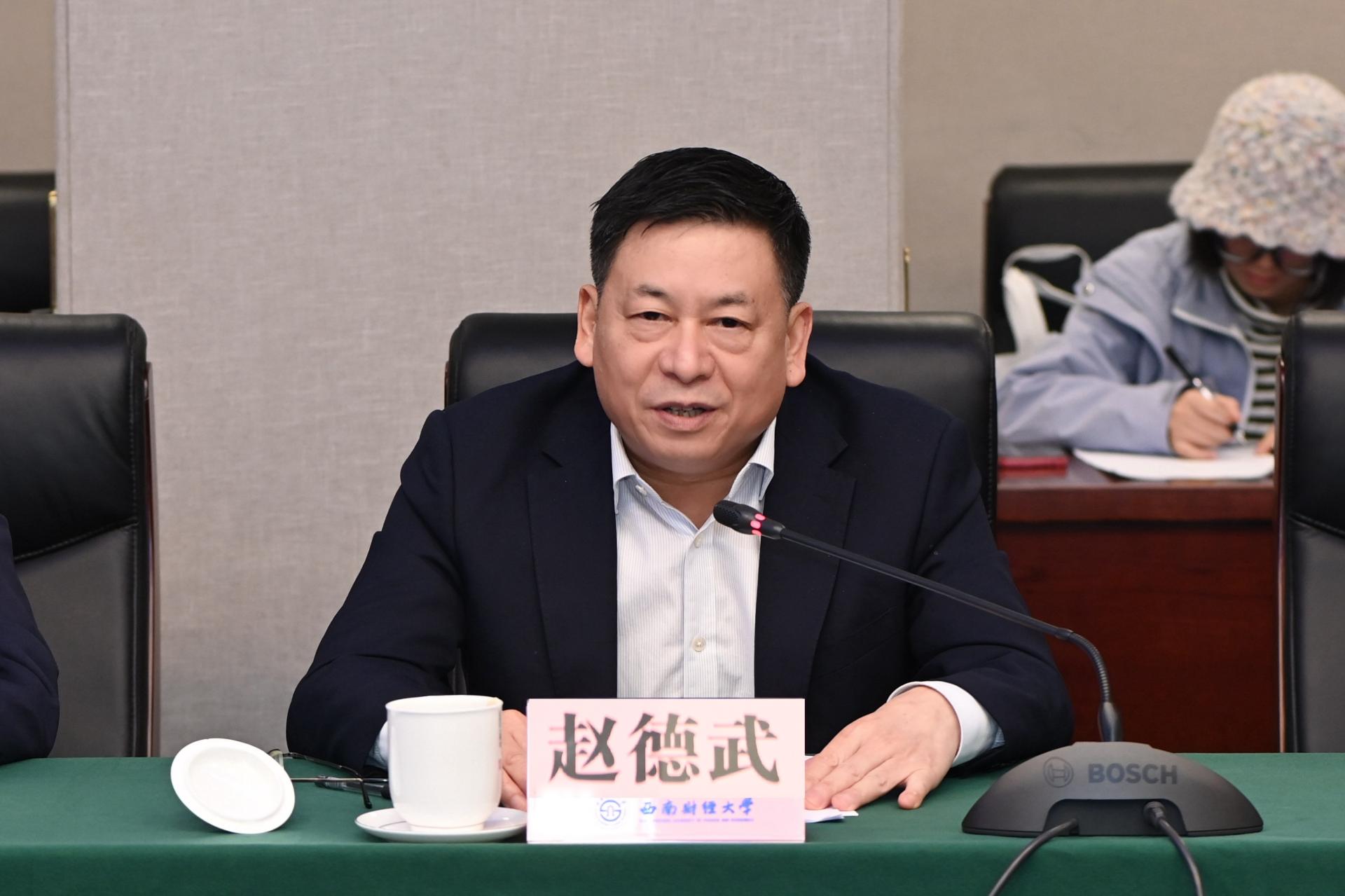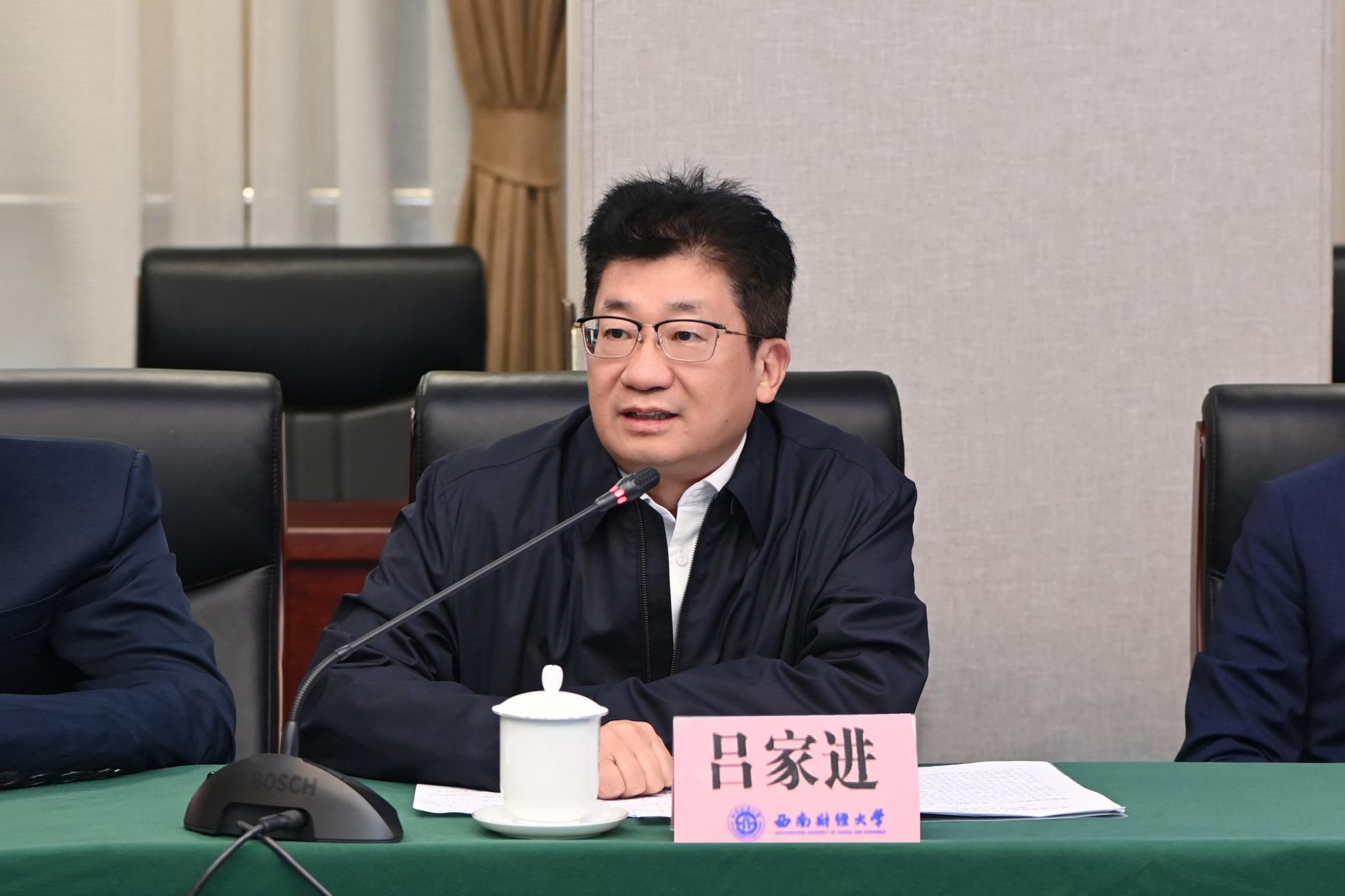 趙德武對呂家進一行表示熱烈歡迎。他詳細介紹了學校的歷史沿革、基本概況與辦學特色,重點介紹了學校深入貫徹黨的二十大關于科教興國戰(zhàn)略部署,全面推進“新財經(jīng)”戰(zhàn)略升級,著力推進一流學科培優(yōu)、財經(jīng)科技創(chuàng)新、人才引領支撐“三大行動”,全力建設“習近平經(jīng)濟思想研究院”一流學科集成創(chuàng)新平臺和“數(shù)字經(jīng)濟與交叉科學創(chuàng)新研究院”財經(jīng)科技集成創(chuàng)新平臺“兩大平臺”,加快建設中國特色哲學社會科學高地、財經(jīng)科技創(chuàng)新高地、西部及全國一流財經(jīng)人才高地“三大高地”的探索實踐。他表示,此次全面戰(zhàn)略合作協(xié)議的簽訂是雙方深入學習貫徹黨的二十大精神和中央金融工作會議精神的具體實踐,對于更好地服務國家戰(zhàn)略、爭創(chuàng)一流、推動高質(zhì)量發(fā)展具有重大而深遠的意義,并圍繞助推金融高質(zhì)量發(fā)展、服務四川現(xiàn)代化建設、加強人才交流等方面提出合作建議。