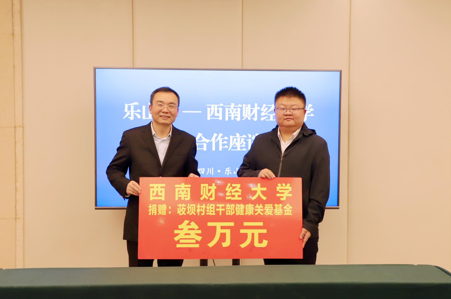 座談會(huì)上,雙方進(jìn)行了校地合作簽約儀式和就業(yè)實(shí)習(xí)基地授牌儀式。馬永強(qiáng)為校友徐亞雄頒發(fā)了“全國(guó)高校畢業(yè)生基層就業(yè)卓越獎(jiǎng)”獎(jiǎng)杯和證書(shū),并代表學(xué)校捐贈(zèng)3萬(wàn)元支持荍壩鎮(zhèn)成立村組干部健康關(guān)愛(ài)基金。