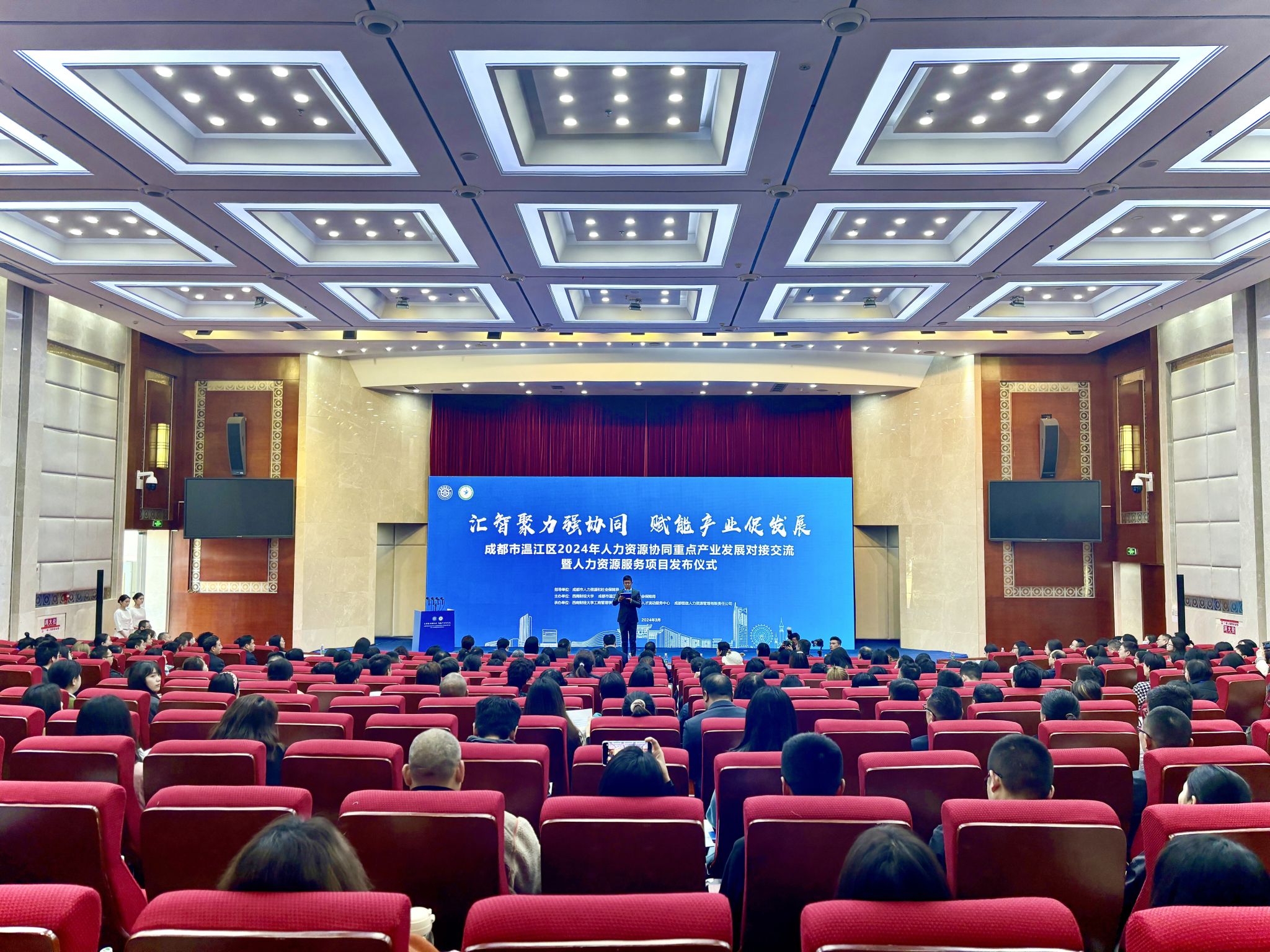 3月14日,由成都市人社局、溫江區人社局、西南財經大學主辦,工商管理學院承辦的“成都市溫江區2024年人力資源協同重點產業發展對接交流暨人力資源服務項目發布儀式”在學校弘遠樓報告廳舉行。學校黨委常委、副校長史代敏,成都市人社局黨組成員、副局長李果,成都市就業局黨委書記、局長皮大云,溫江區委常委、組織部部長羅胤等領導出席,相關政府部門、重點企業代表、學校師生代表共300余人參與活動。