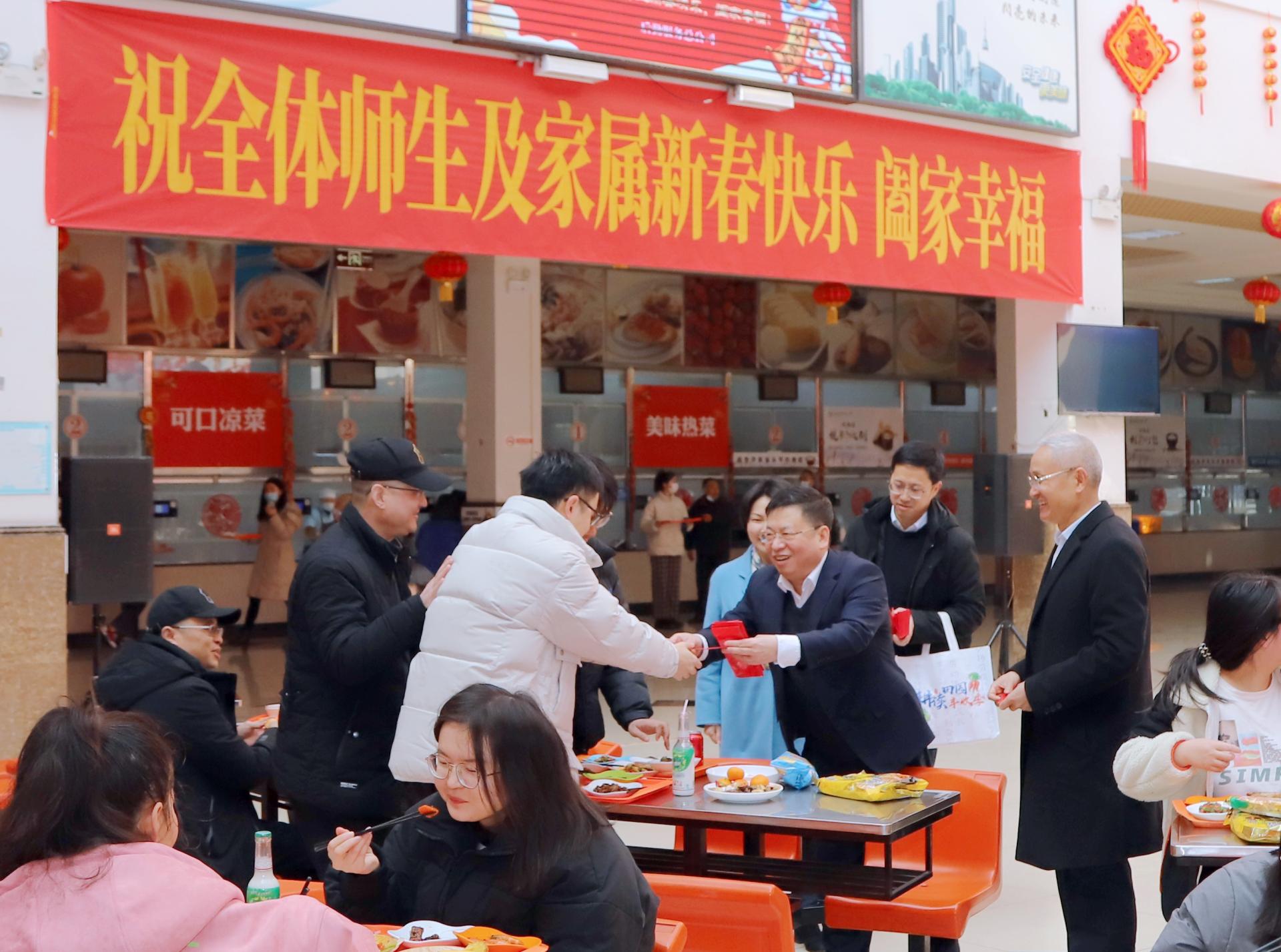 金牛辭歲寒風盡,玉虎迎春喜氣來。在做好常態化疫情防控的前提下, 1月31日中午,學校在柳林校區三味堂一樓舉行2022年寒假留校學生新春團拜會。黨委書記趙德武、黨委副書記曾道榮,相關職能部門和各學院(中心)負責人與200余名寒假留校同學歡聚一堂、喜迎佳節,讓同學們在學校感受“過新年”的熱鬧喜慶氛圍,享受“家”的味道。