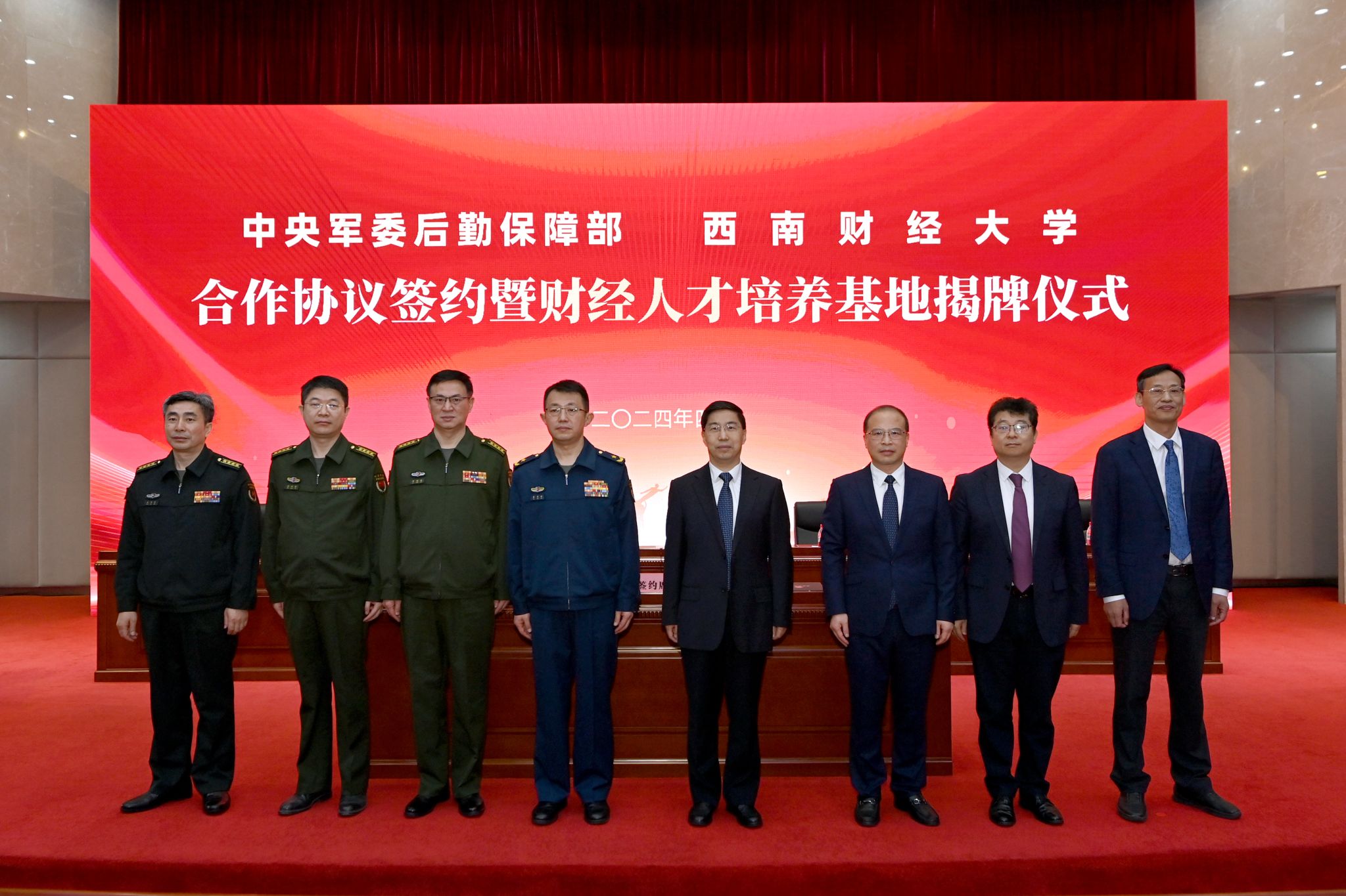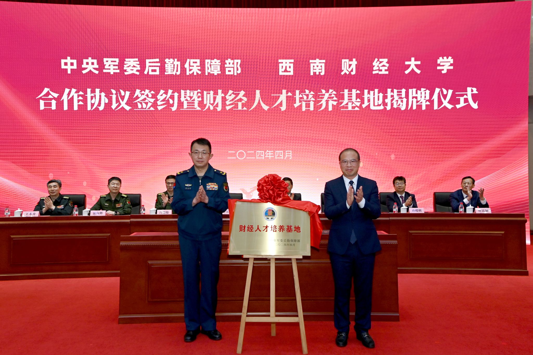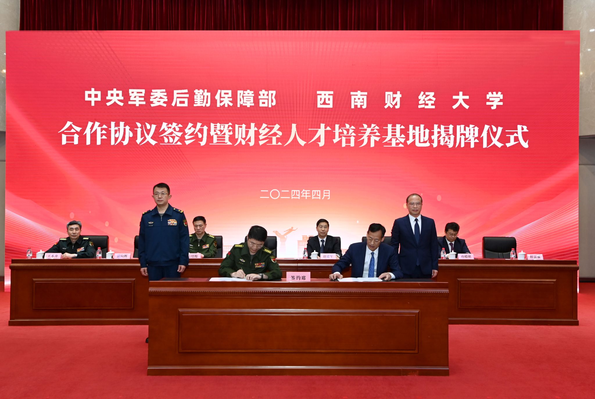 4月23日,學校與中央軍委后勤保障部合作協議簽約暨財經人才培養基地揭牌儀式在弘遠樓105會議室舉行。軍方領導,我校黨委書記趙建軍,黨委副書記、校長李永強,黨委副書記、紀委書記孫殿明,黨委常委、副校長桂富強出席儀式。