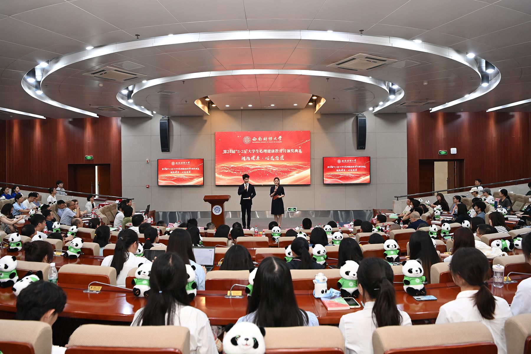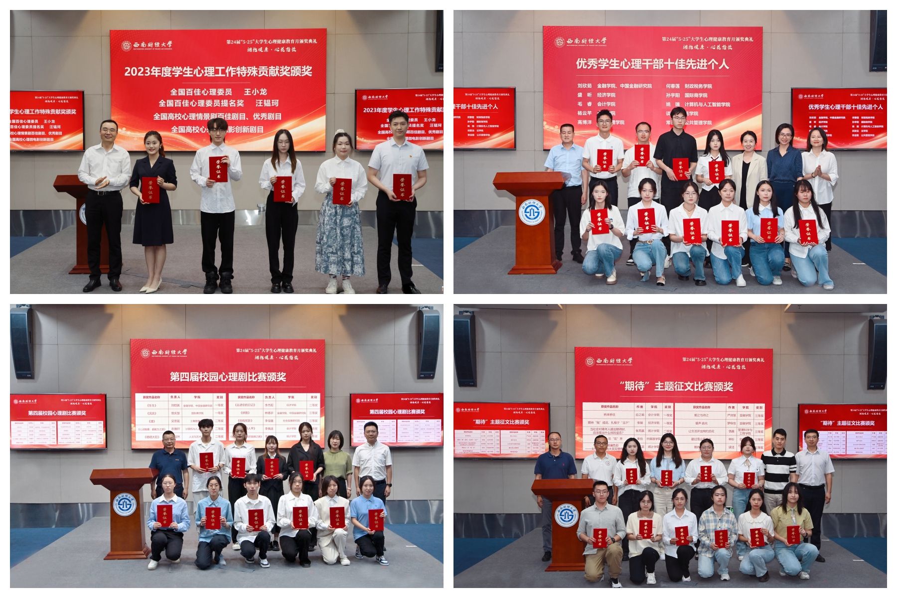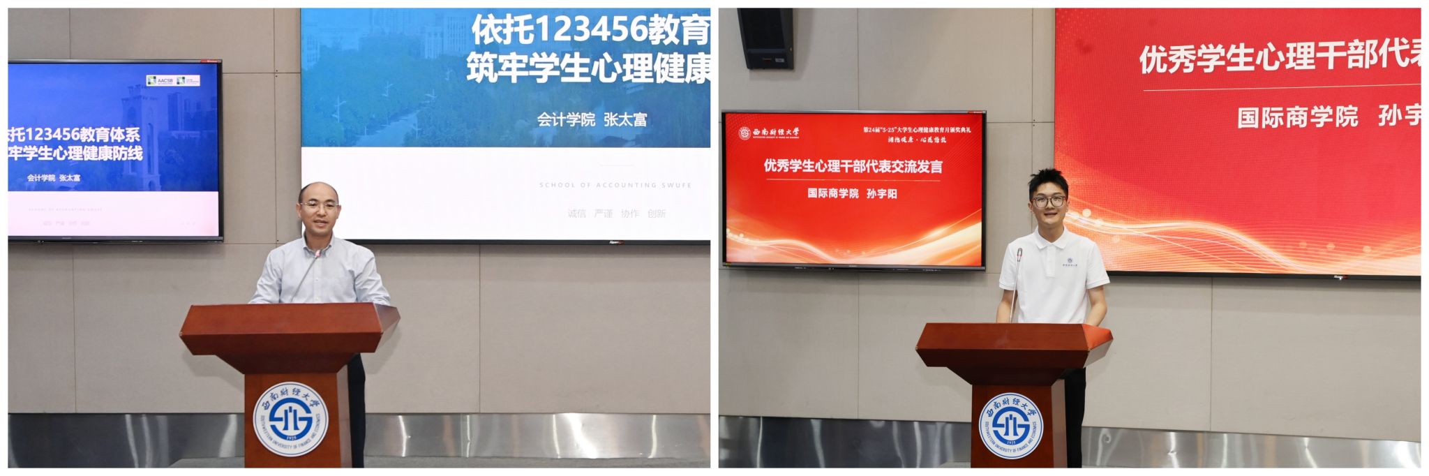 典禮集中展示了心理健康教育月活動開展情況、優秀集體和個人先進事跡,為主題征文比賽和校園心理劇比賽獲獎隊伍、優秀學生心理干部十佳先進個人、學生心理工作特殊貢獻獎獲獎者頒獎。會計學院學生工作負責人代表首批學院(研究院)心理工作示范站作交流發言,國際商學院本科生孫宇陽代表優秀學生心理干部作交流發言。