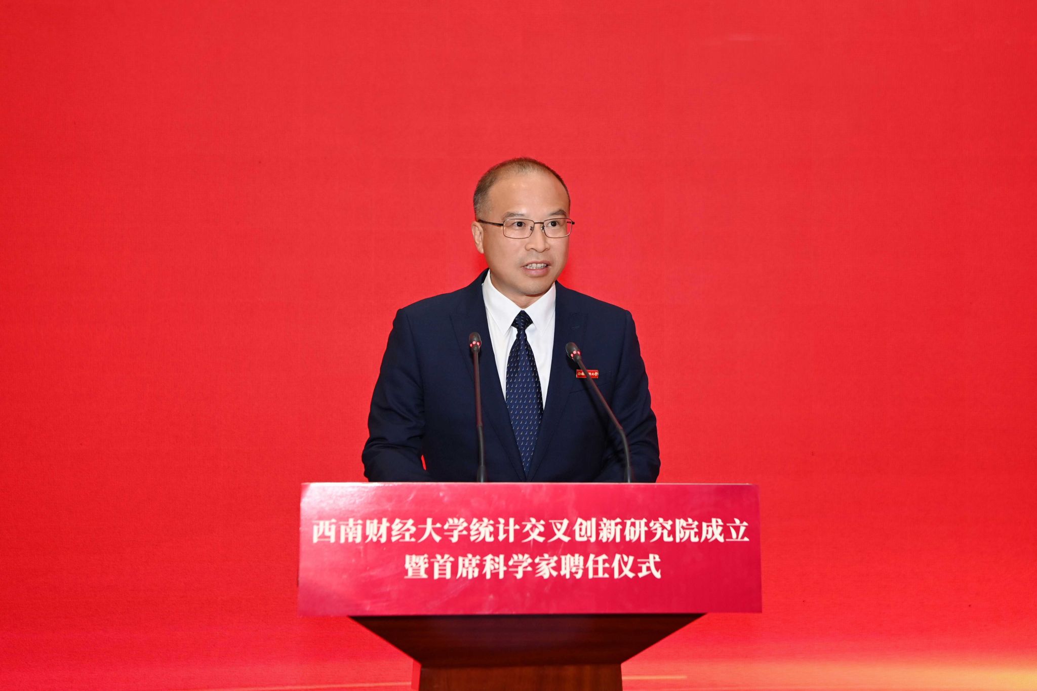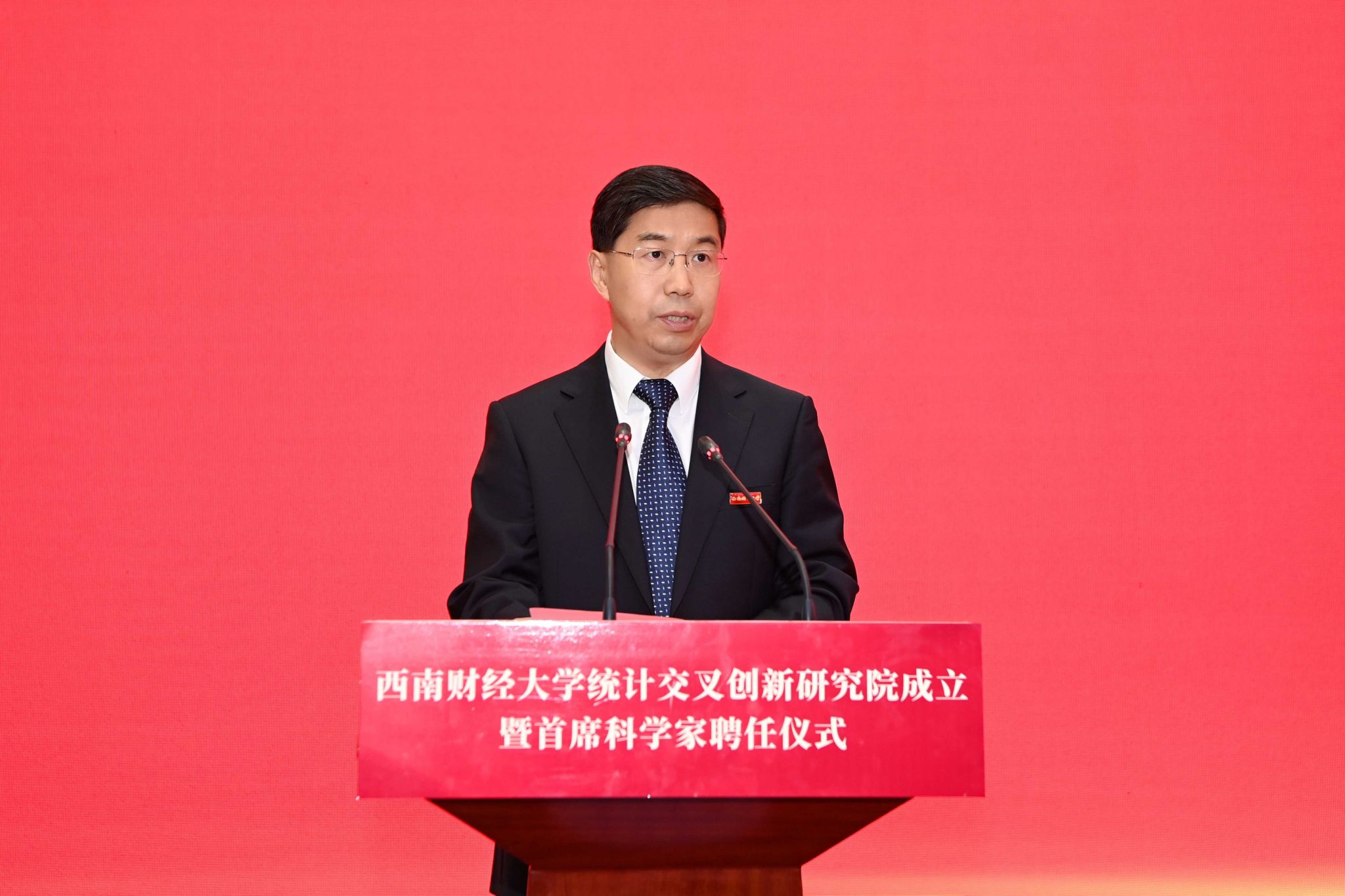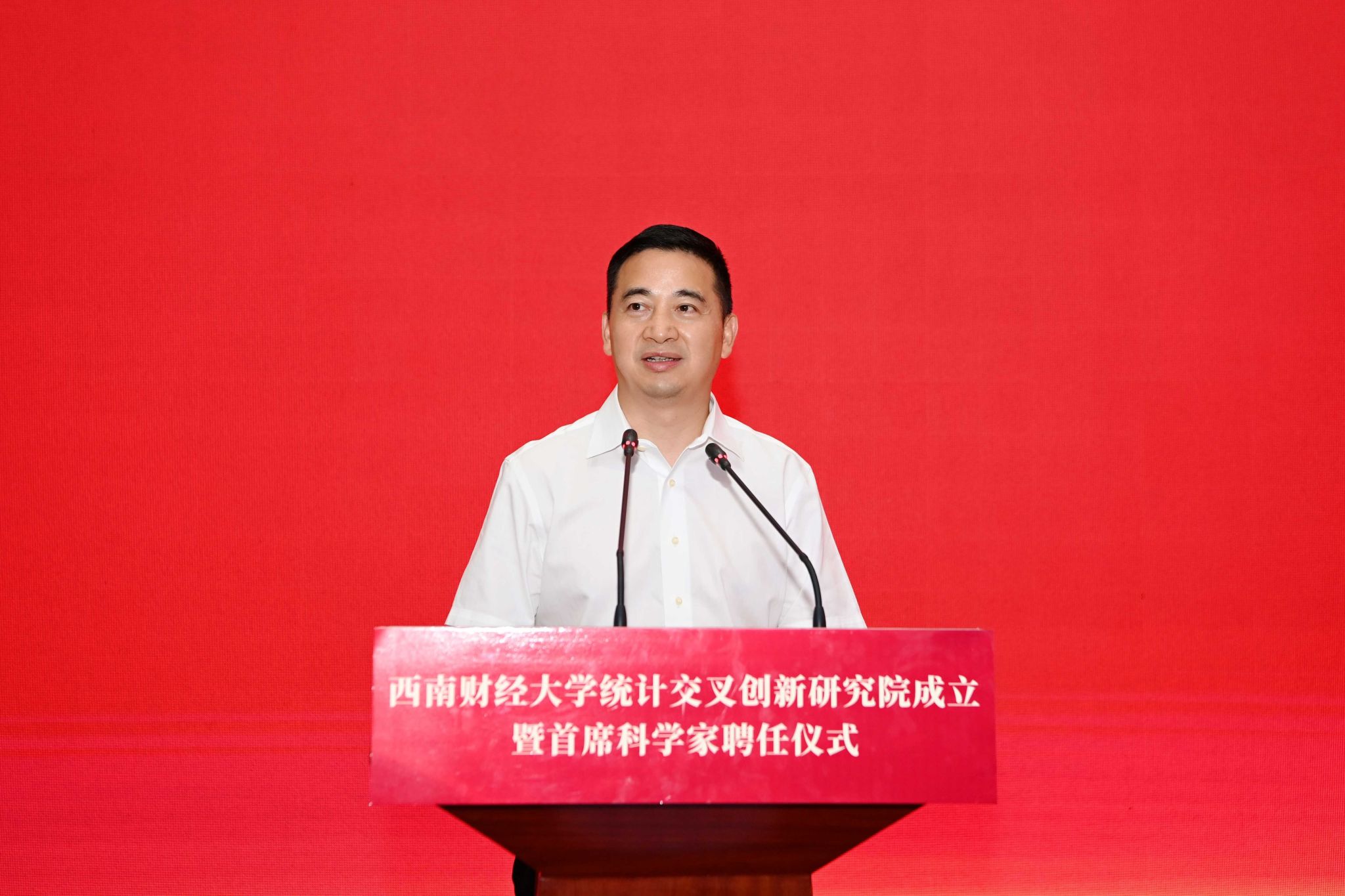 6月3日,西南財經大學統計交叉創新研究院成立暨首席科學家聘任儀式在柳林校區弘遠樓105會議室舉行。中國科學院院士陳松蹊,四川省科學技術協會黨組書記、副主席毛大付,省委教育工委副書記、教育廳黨組成員張瀾濤,省委組織部二級巡視員、公務員二處處長楊瑛,成都市工商聯主席、總商會會長俞建,全體校領導出席儀式。黨委書記趙建軍致辭,黨委副書記、校長李永強主持儀式。相關職能部門主要負責人、各學院(研究院)院長、校友代表、師生代表參加儀式。