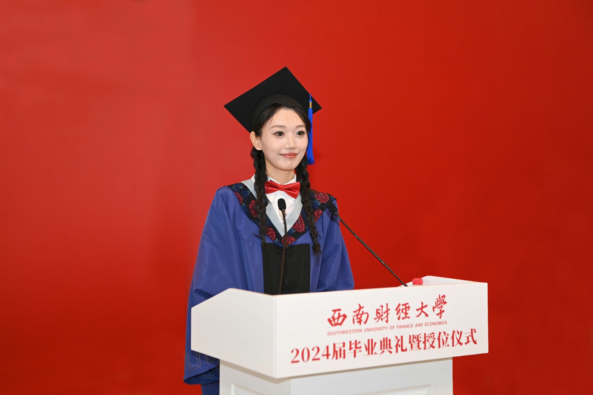 畢業(yè)生代表王怡焯發(fā)言,與在場(chǎng)師生共同回顧追夢(mèng)奮斗的西財(cái)時(shí)光,表達(dá)對(duì)母校的熱愛、對(duì)父母的感恩、對(duì)師友的不舍,表示將繼續(xù)踐行“經(jīng)世濟(jì)民、孜孜以求”西財(cái)精神,挺膺擔(dān)當(dāng)、砥礪奮斗,力爭(zhēng)成為具有社會(huì)責(zé)任感、創(chuàng)新精神、國(guó)際視野的財(cái)經(jīng)領(lǐng)域卓越人才,書寫更加輝煌的青春篇章。